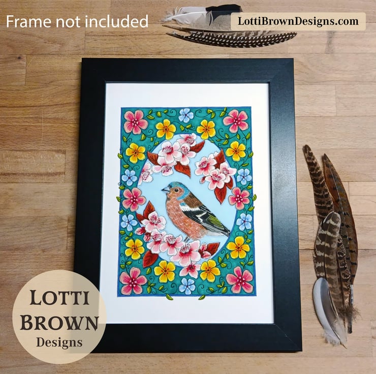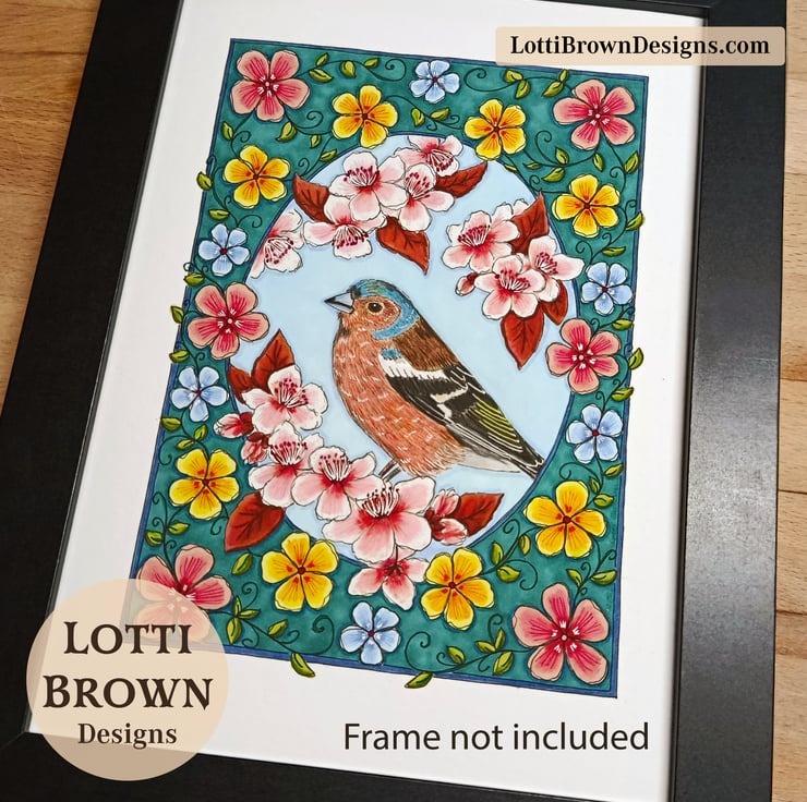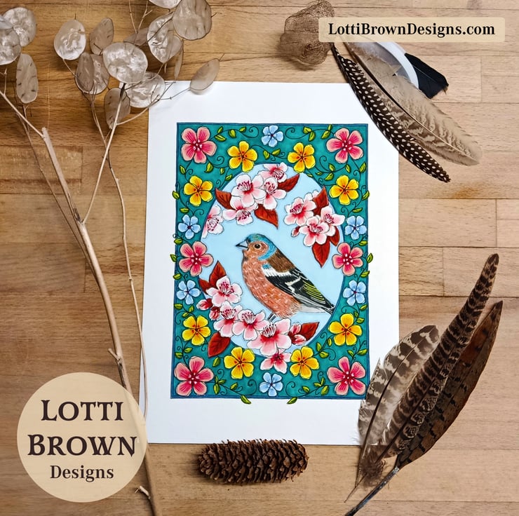 This artwork is inspired by the cheerful chaffinches we see in our garden and in the fields around the village where we live in East Yorkshire. I love to hear their beautiful song as we walk in the Spring mornings and this artwork celebrates that with beautiful Spring blossoms...