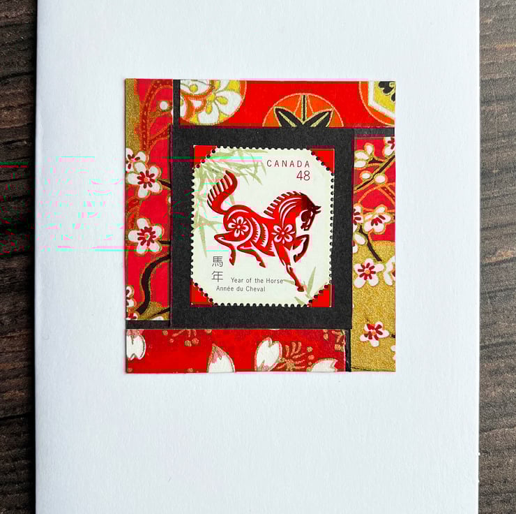 At its centre is a pretty Canadian postage stamp with a red metallic horse. I've mounted it on black paper and made a border using origami papers in shades of red and gold. The papers have metallic gold in them which adds a lovely bit of sparkle.