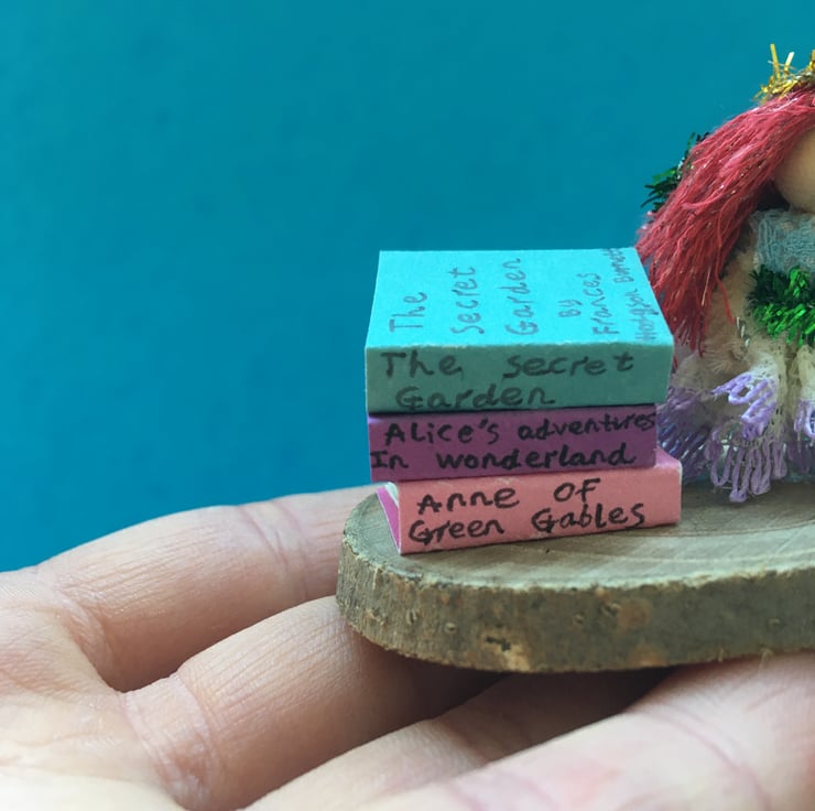 There is a little stack of books with classic book titles like 'The Secret Garden'.