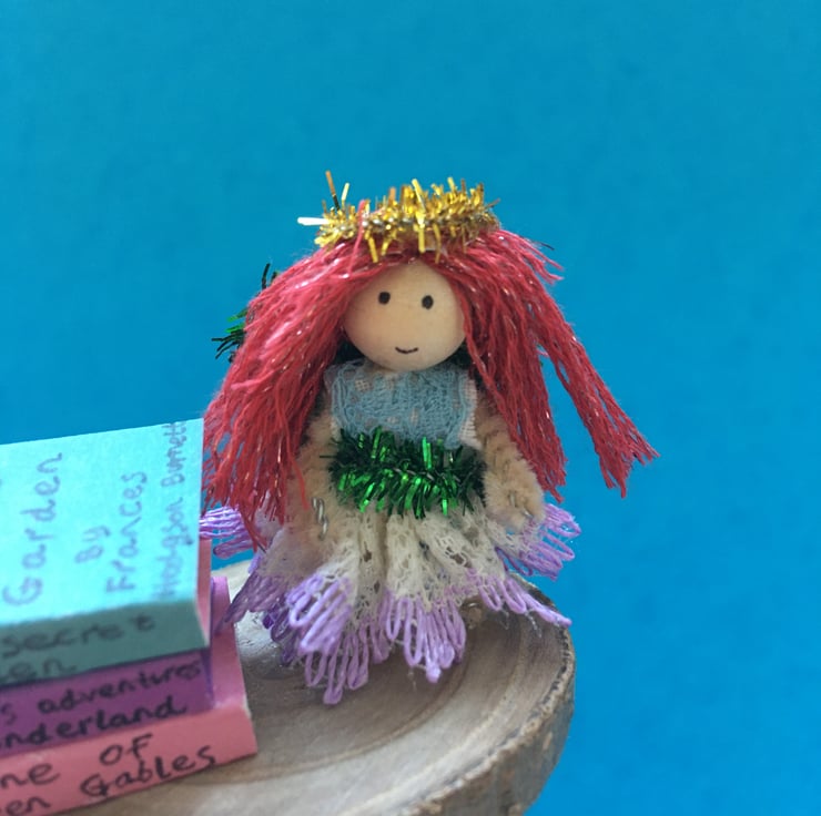 The extra tiny fairy has a pipe cleaner body, wooden bead head with carefully hand draw features, a lace dress and sparkly embroidery thread hair.