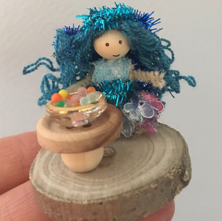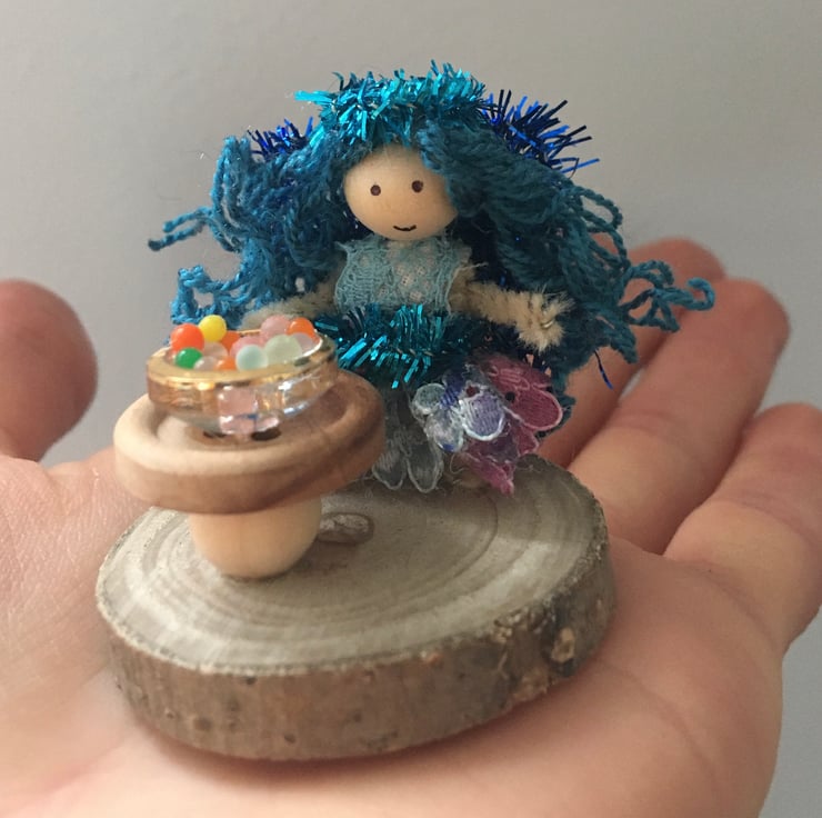 This tiny fairy has a little table made from a wooden bead and button, with a button bowl with tiny ball sweets in.