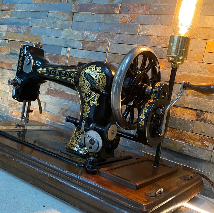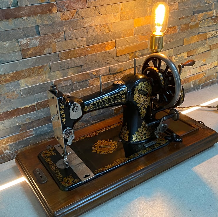 Beautiful 1920s Jones CS family sewing machine . In fantastic condition and still functional . You could actually still sew with this machine even though I have converted to a table lamp . It almost like it was meant to be ! The machine itself was sourced locally and had been in the family and used for all its life. Condition is very good. I have installed new period style twisted cable with inline switch , bakelite style 3 amp plug, lamp holder extension and new superior brass vintage style lamp holder which take E27 large screw in bulb. the worlds your oyster when it comes to vintage bulbs . Independently PAT tested for safety. Also this comes with its original ornate timber lid, which will be given with the lamp. Advise collection only as its heavy.