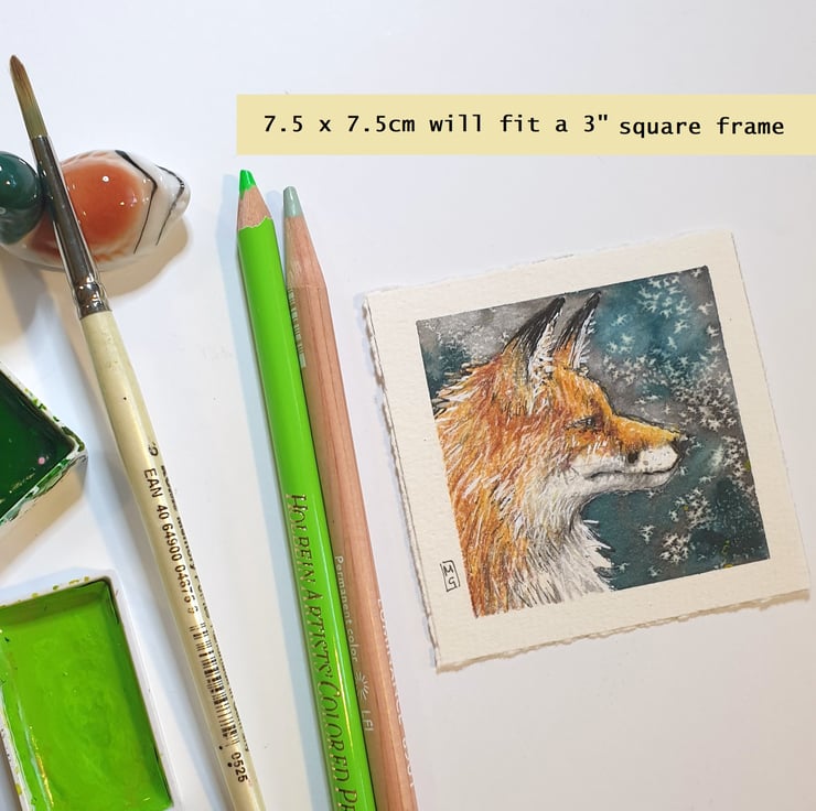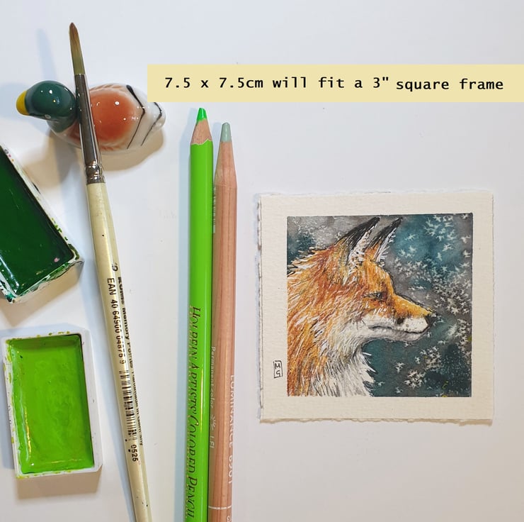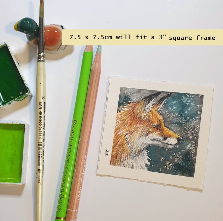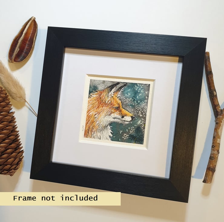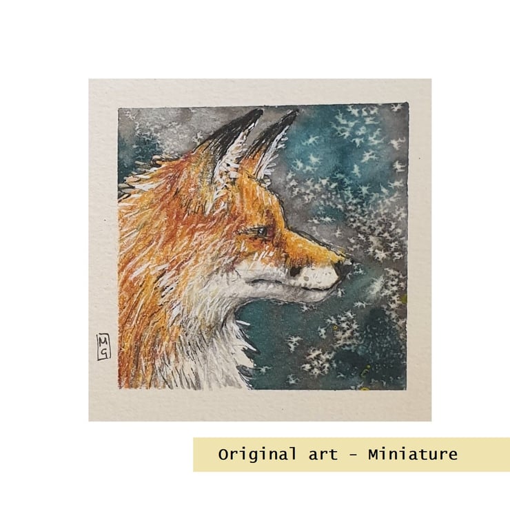 A tiny artwork of a portrait of a red fox in profile, with a grey and violet speckled watercolour background.