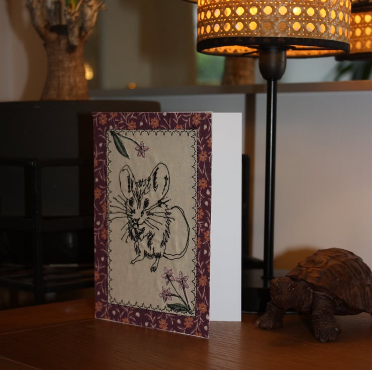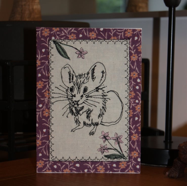 5" x 7" (12.5cm x 17.5cm) on 300g white card with white envelope. Free-stitched burgundy mouse with a floral edge card