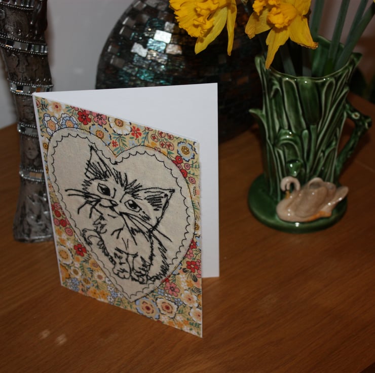 5" x 7" (12.5cm x 17.5cm) on white rough 300g card with white envelope. Free-stitched cute kitten on a heart with a mixed floral background
