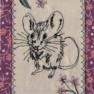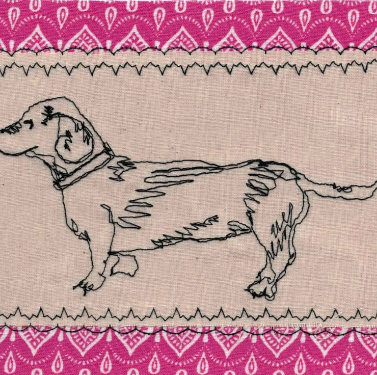 5" x 7" (12.5cm x 17.5cm) on white rough 300g card with white envelope. Free-stitched dachshund with a bright pink border.