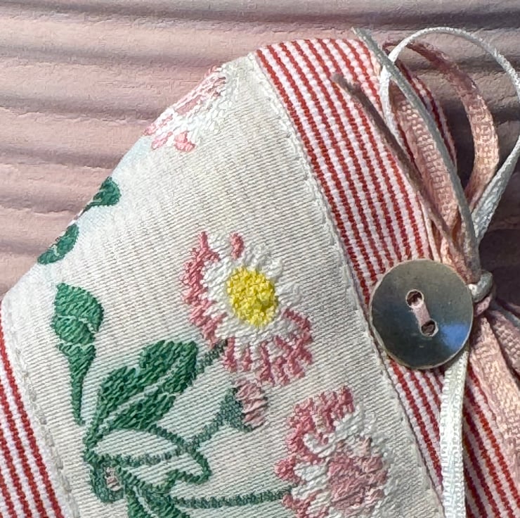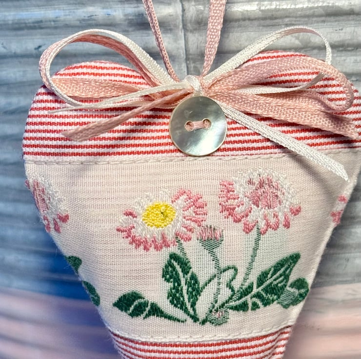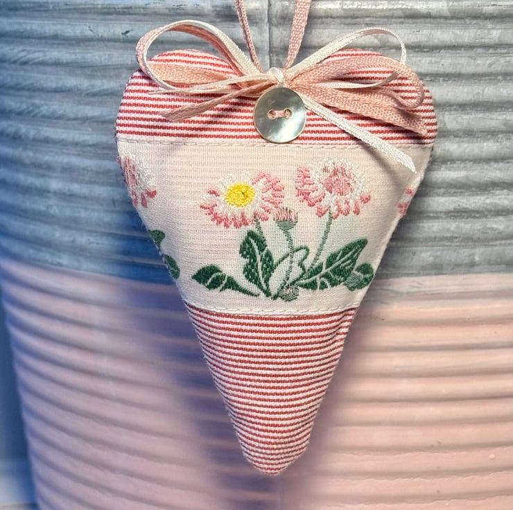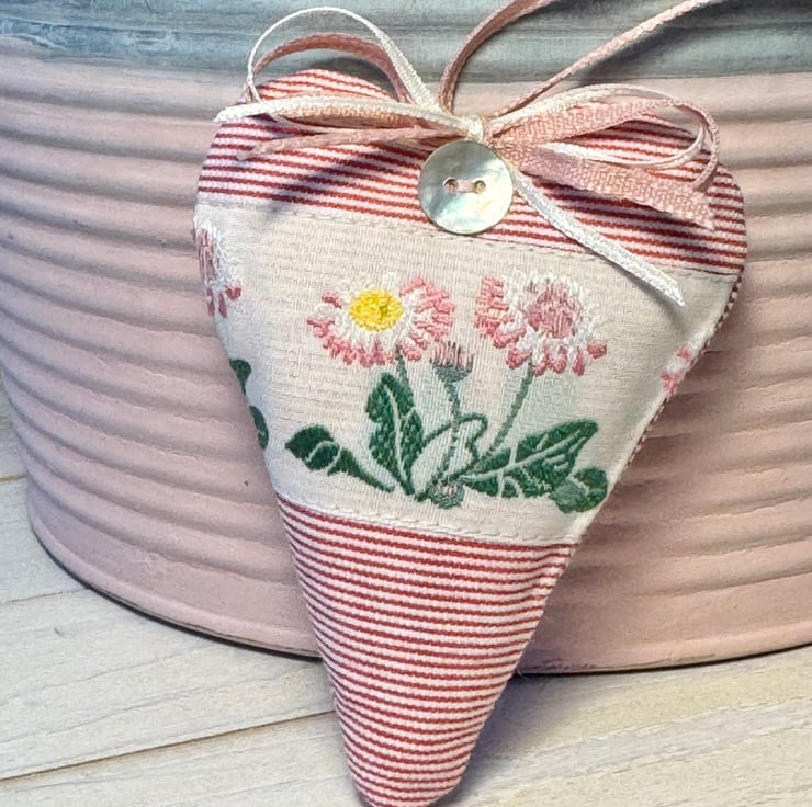 This heart has narrow raspberry pink and ivory stripes and a pretty woven ivory ribbon featuring beautiful wild daisies in shades of pink and white, with vibrant green leaves.