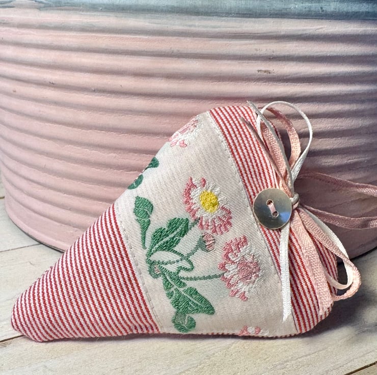 Generously filled with gloriously fragrant and locally grown Hampshire lavender and finished with a shimmery mother-of-pearl round button, double ivory and pink ribbon bows and pink ribbon hanging ties, and with a linen 'h&h' label on the reverse side.
