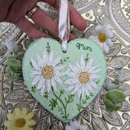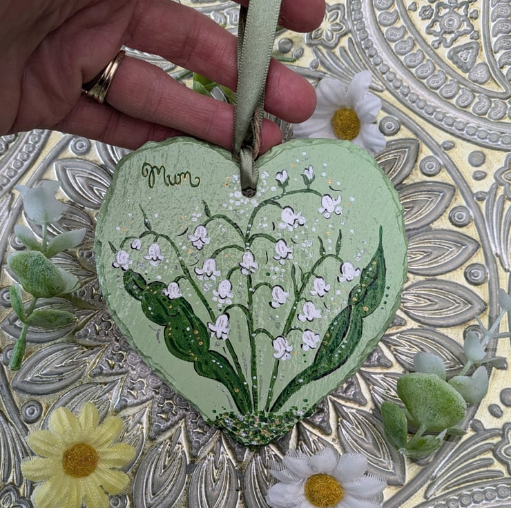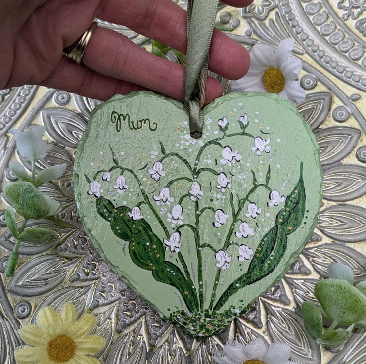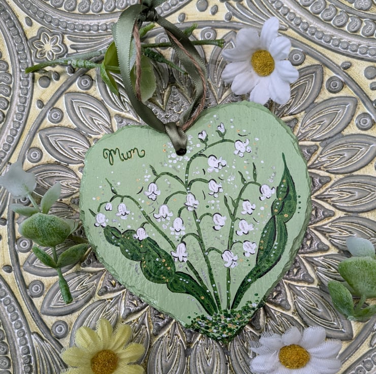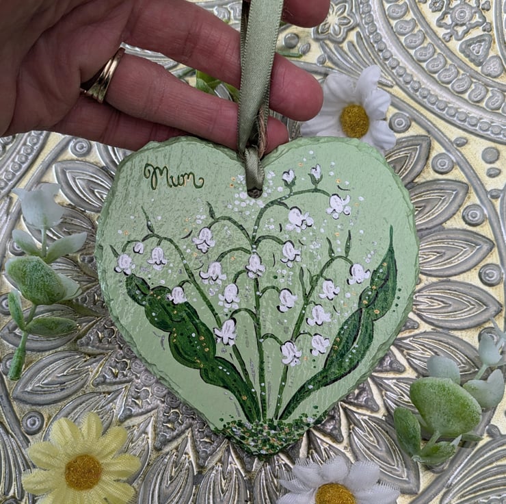 A beautiful hand-painted Lily of the valley slate heart decoration personalised with the word "Mum" on the front of the heart.