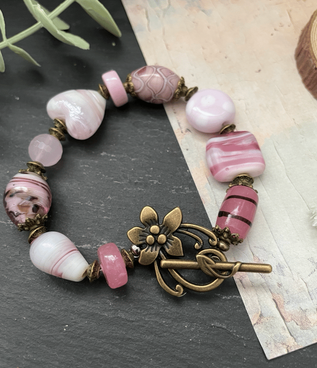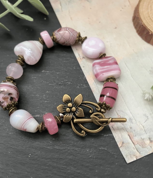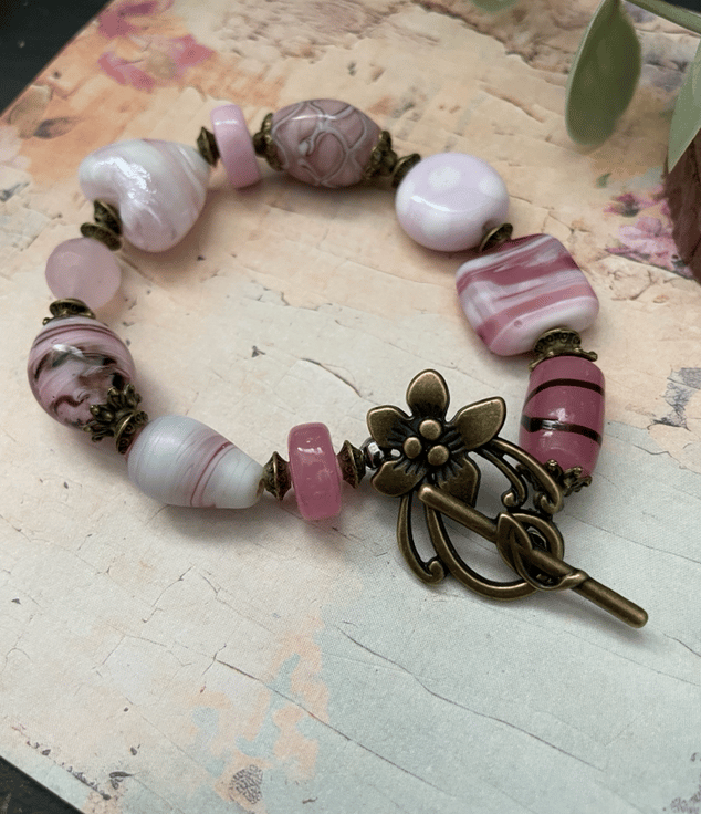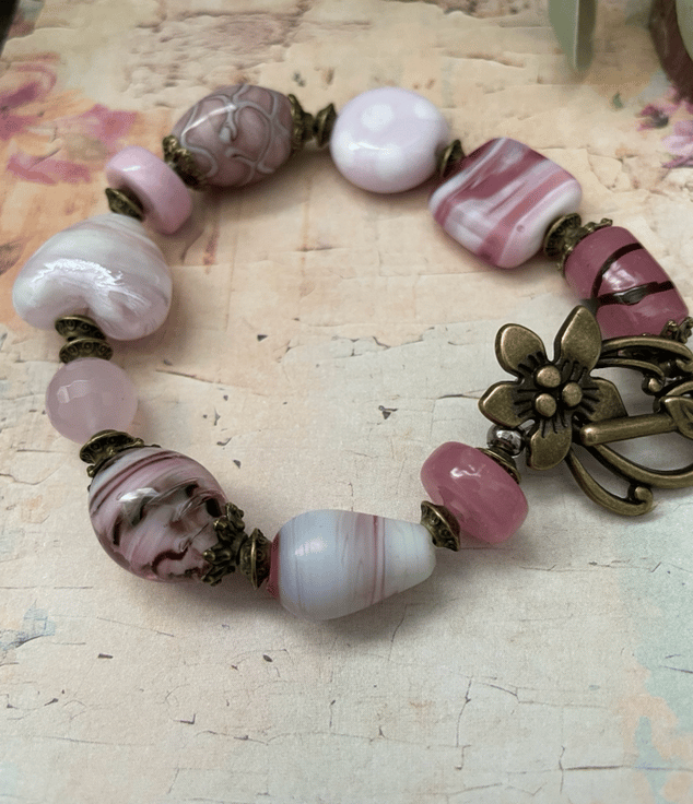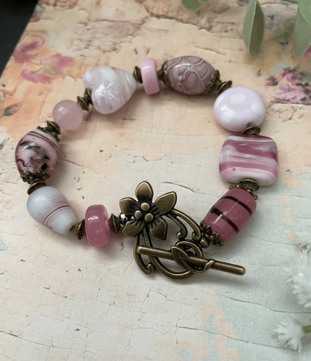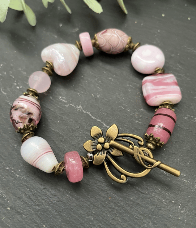A gorgeous selection of Lamp work handmade glass beads in shades of pink come together beautifully, linked using antique bronze tone bead caps and spacer beads . secured with a pretty floral toggle clasp in antique bronze.