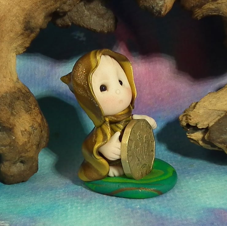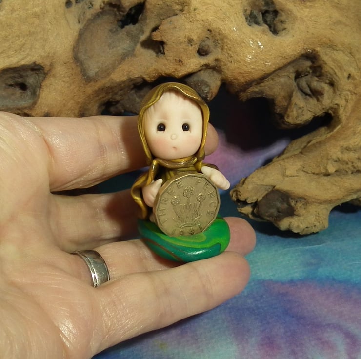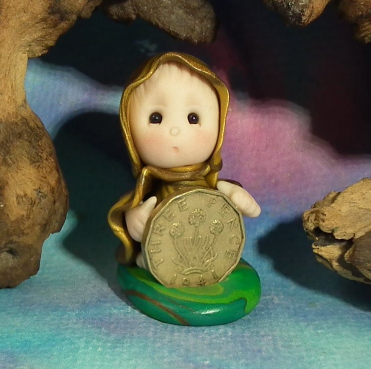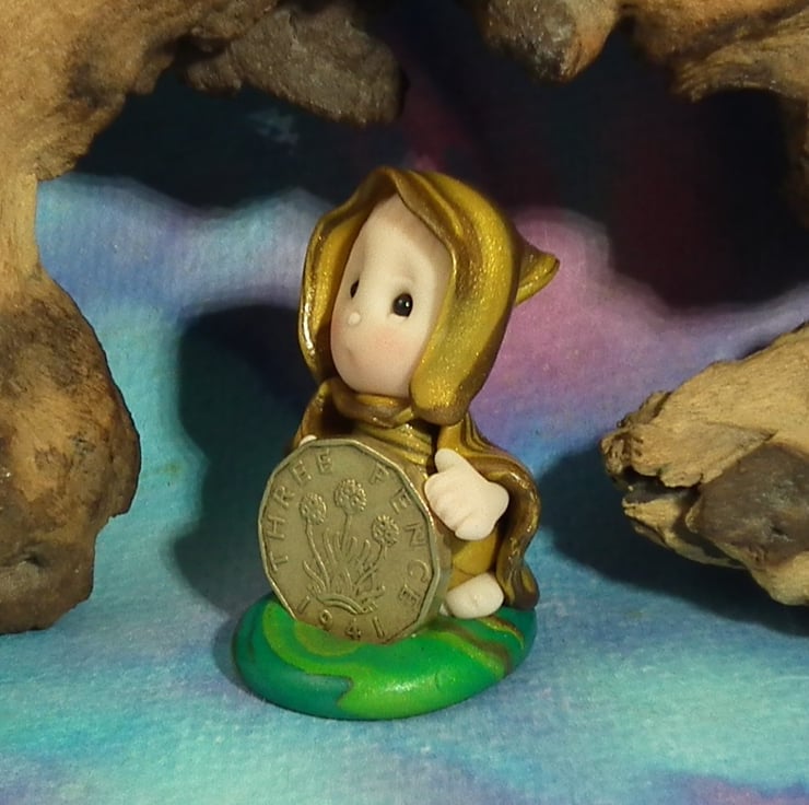 This is a 'one of a kind' creation having been entirely handmade without the use of moulds here at my studio on the Sussex Coast. Modelled with artist blend polymers, blushed before sealing with lacquer, Bert has sparkling black onyx eyes and variegated robes. Bert the Thrupenny Bit Gnome is just one and a half inches tall, the coin is not removable.