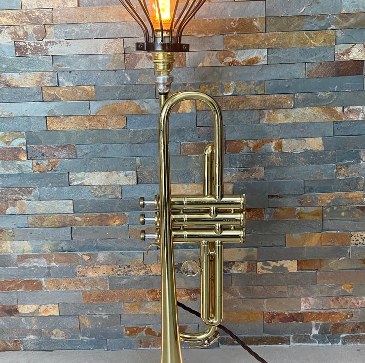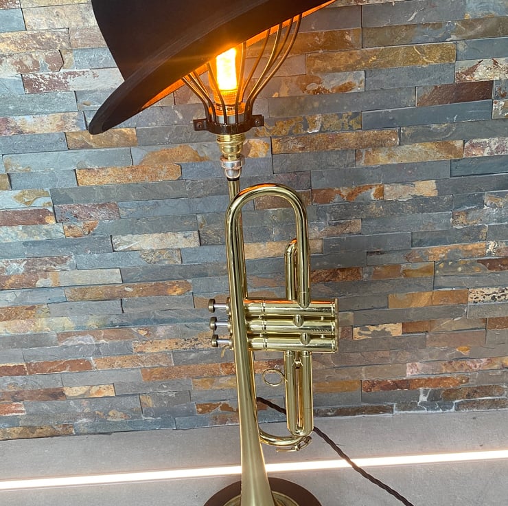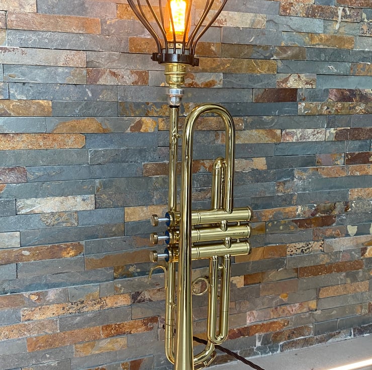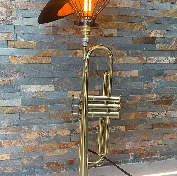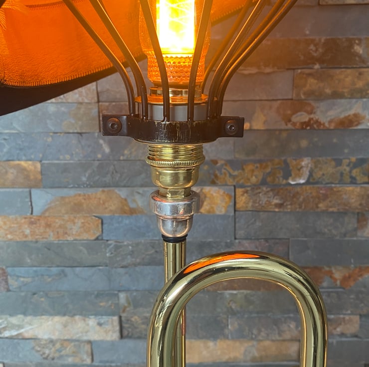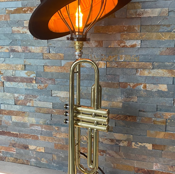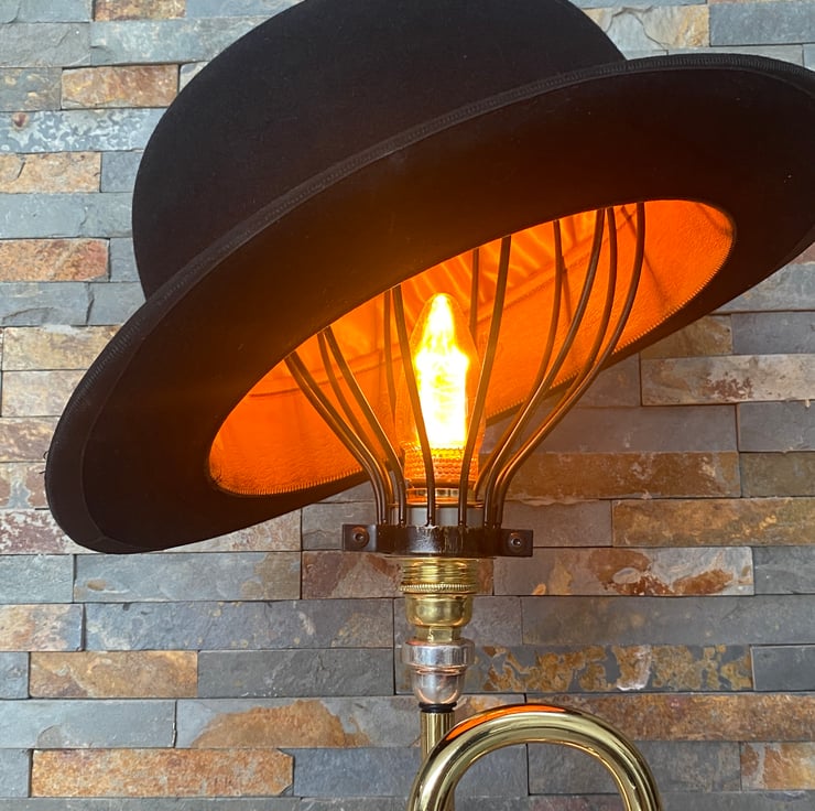This totally unique lamp has been carefully thought out and up-cycled/constructed by myself. I sourced a traditional little used trumpet of which I have all the original travel case etc. I then did the up-cycle to this stunning talking piece. The timber plinth was made by myself and the trumpet mounted . All new electrics including Bakelite style 3A plug , period correct twisted 3 core cable with inline switch. new lamp holder set into the mouthpiece, Lovely LED vintage style bulb .Independently PAT tested . We then went an extra step . New bulb cage and we sourced a vintage Dunn and co bowler hat with a gold satin lining . This has good value as is and can just lift off and use . The gold satin on the inside reflects the light so well , the effect is "groovy" as they say in the jazz world. This is a total one off .