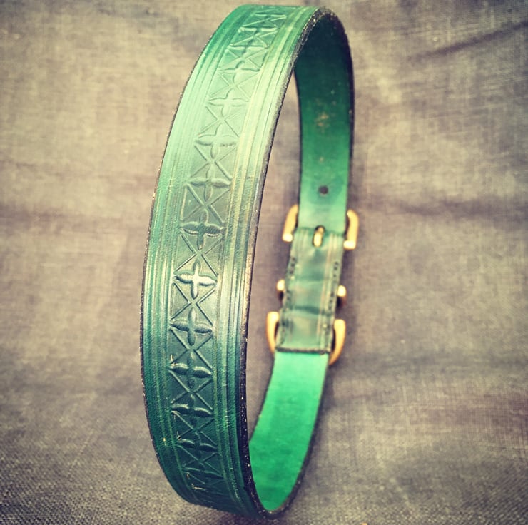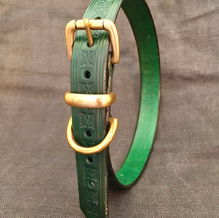 These elegant collars are lovingly handmade by myself. Every collar is cut, stitched, embossed and dyed by hand. Each item is made to order, which takes on average 3-5 days.