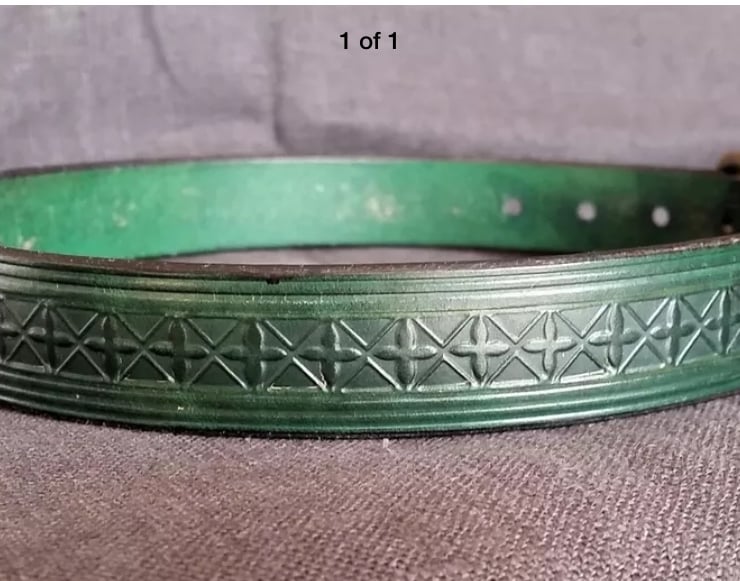 This gorgeous collar is made from high quality, English Veg-Tan Leather. Vegetable tanned leather refers to the method of tanning the hide, “vegetable” because of the natural materials used in the tanning process, such as Oak Bark. This process creates very malleable hides, making them especially good for embossing.