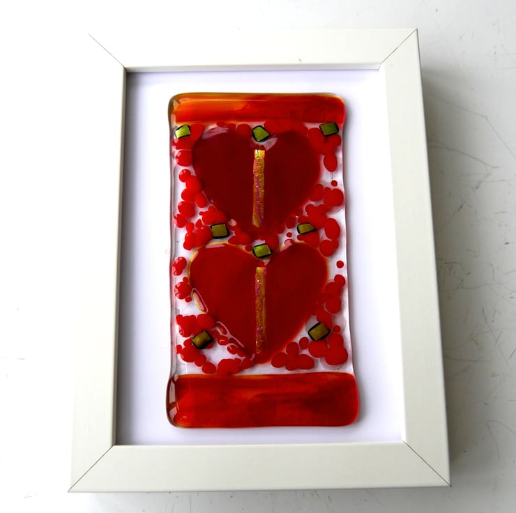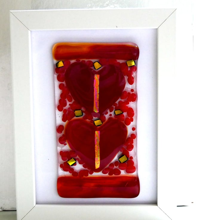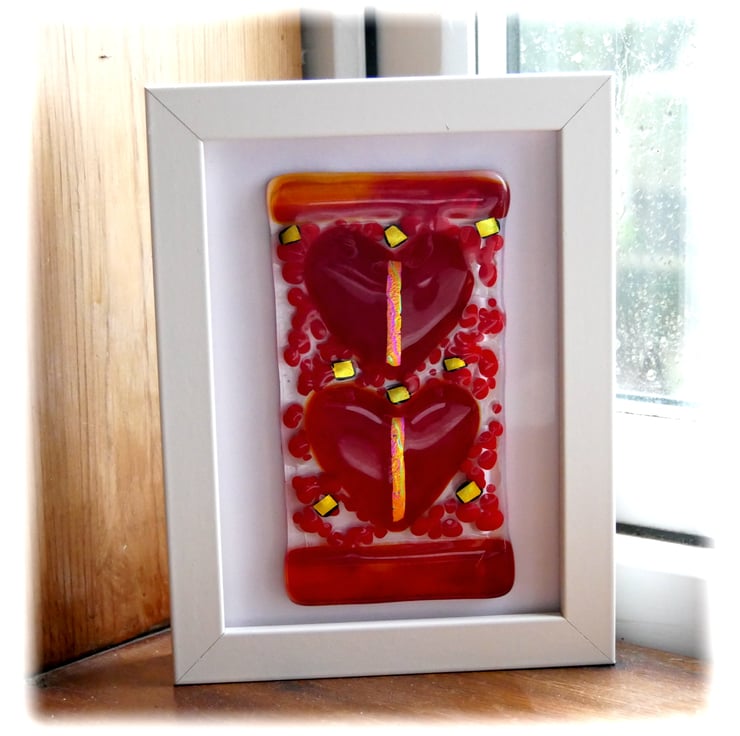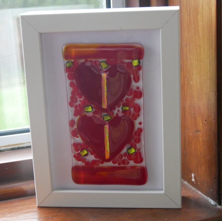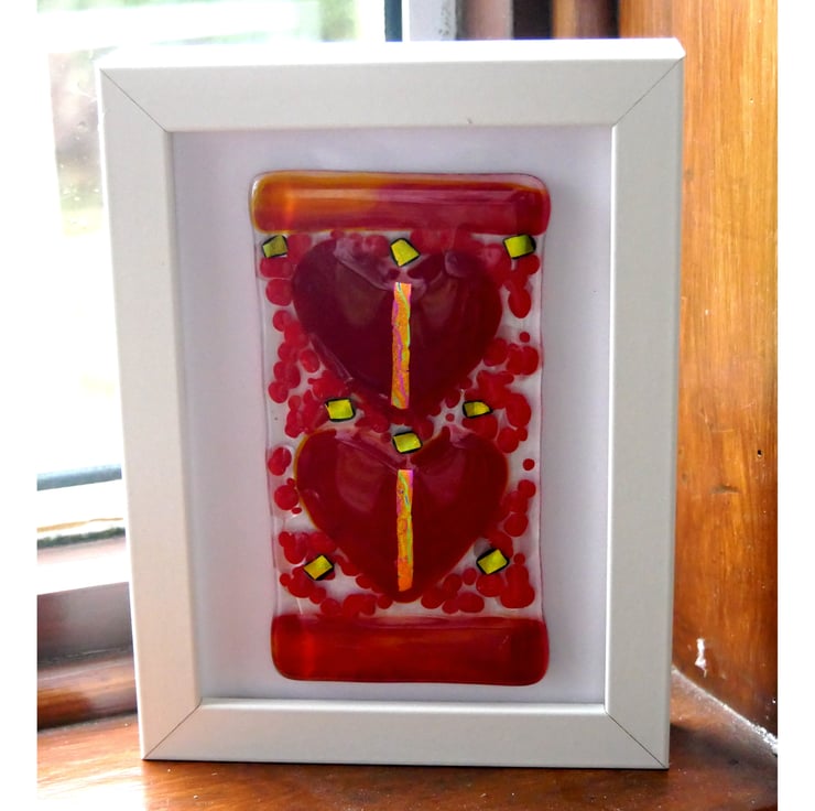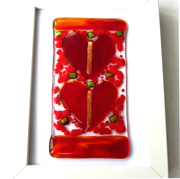 Lovely to gift, this gorgeous picture of two bright red hearts has a band of streaky red glass top and bottom to frame the hearts.
