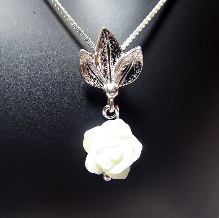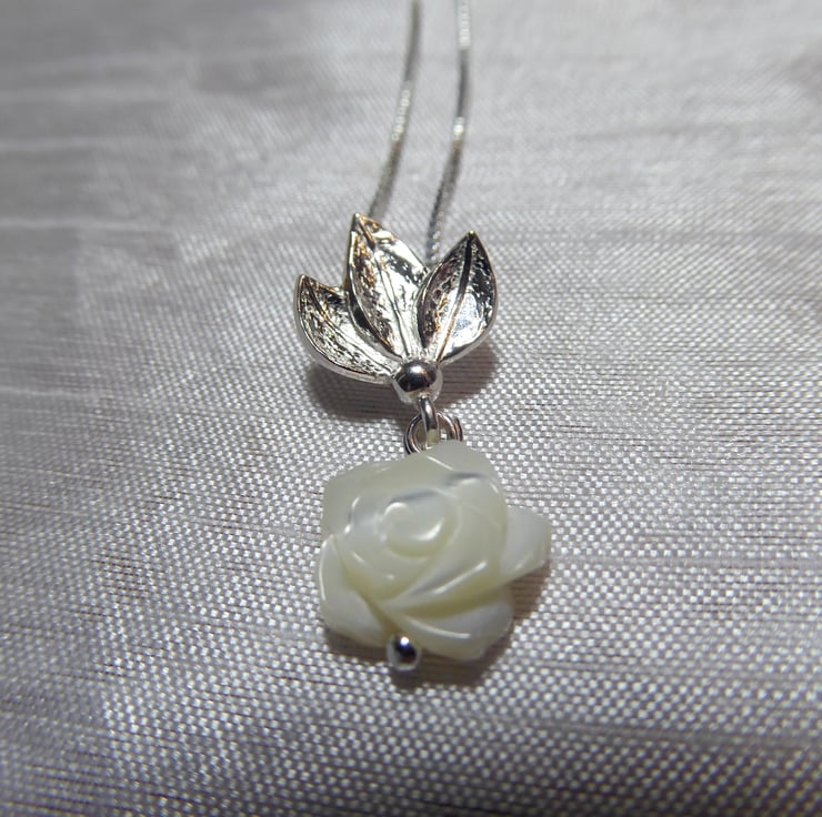 Sterling Silver & Mother of Pearl Rose & Leaves Necklace 18 inch box chain