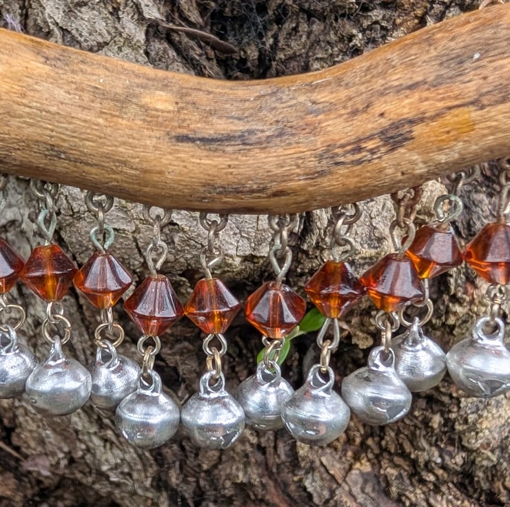 Naturally shaped driftwood forms the structure, bearing the marks of time, tide, and movement. It has been carefully cleaned and left raw, allowing its history to remain visible. From it hang layered strands of beads and metal charms, arranged by hand to create weight, rhythm, and balance.