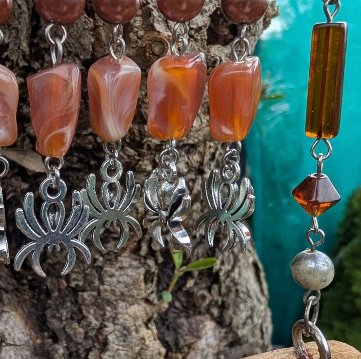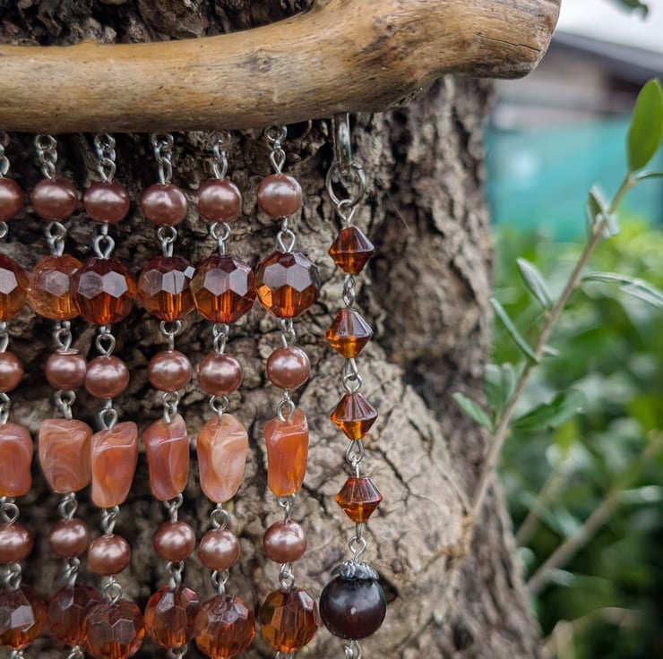 The materials were chosen not for perfection, but for tone and texture — warm, earthy, and slightly untamed. The piece moves gently with the air, catching light and shadow as it hangs.