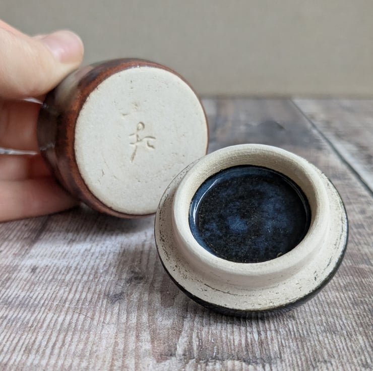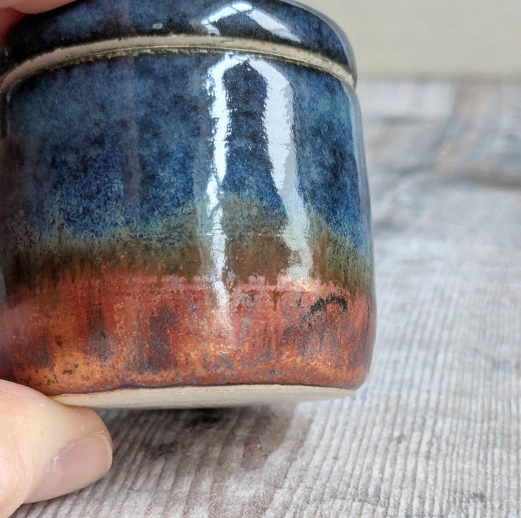 A small ceramic pot wheel thrown from a white stoneware clay. The glaze is dark blue with an uneven stripe of copper around the base.