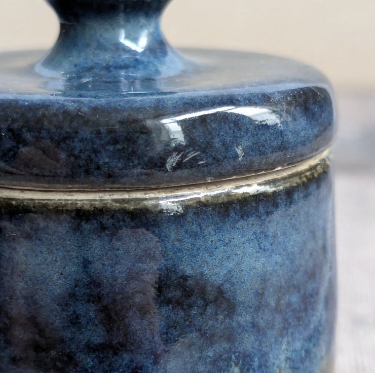 The flaw- There is a very tiny scratch on the lid, see photo 2. It's barely noticeable but nevertheless a tiny flaw on the glaze.