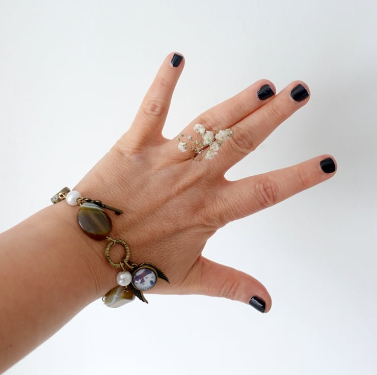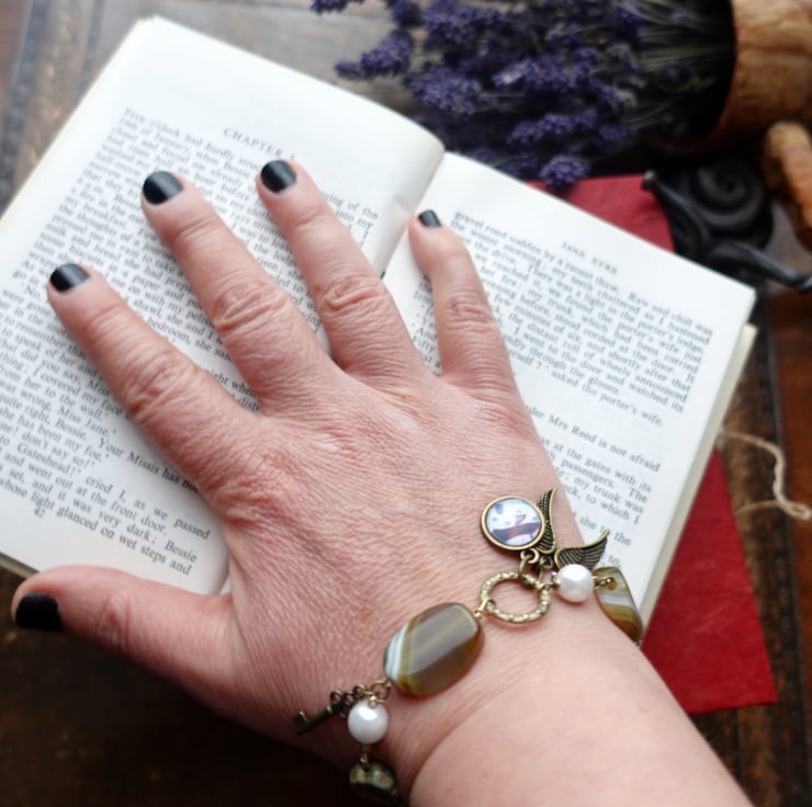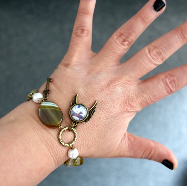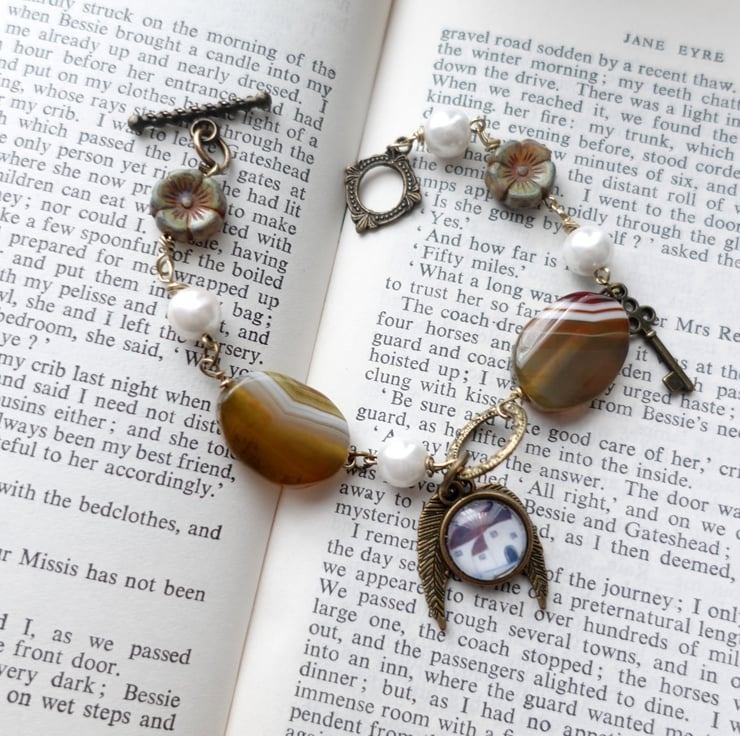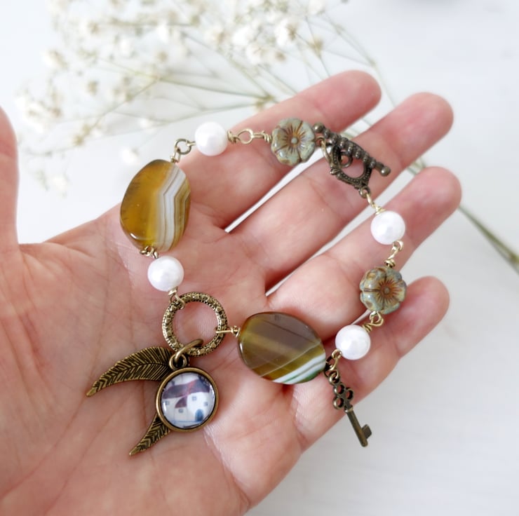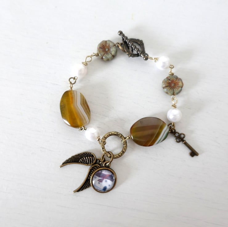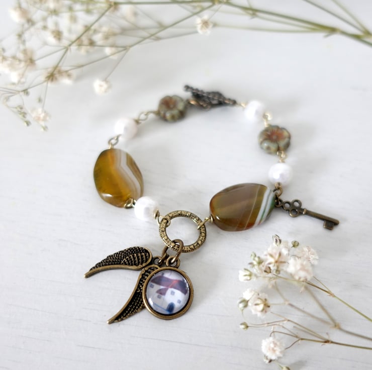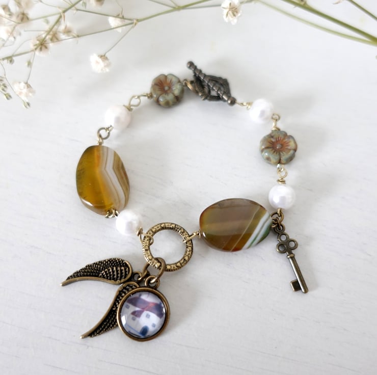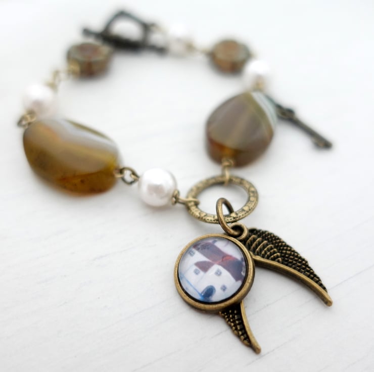 This bracelet is created using agate beads, faux pearls, Czech flower beads and bronze findings and charms. It features an art charm with a print from one of my original naive art paintings showing a Devon-inspired Cottage. The other charms are angel wings and a key. The charms are meant to tell a story that you can easily relate to.
