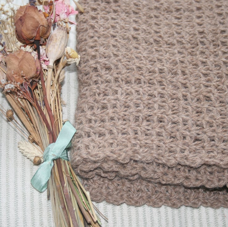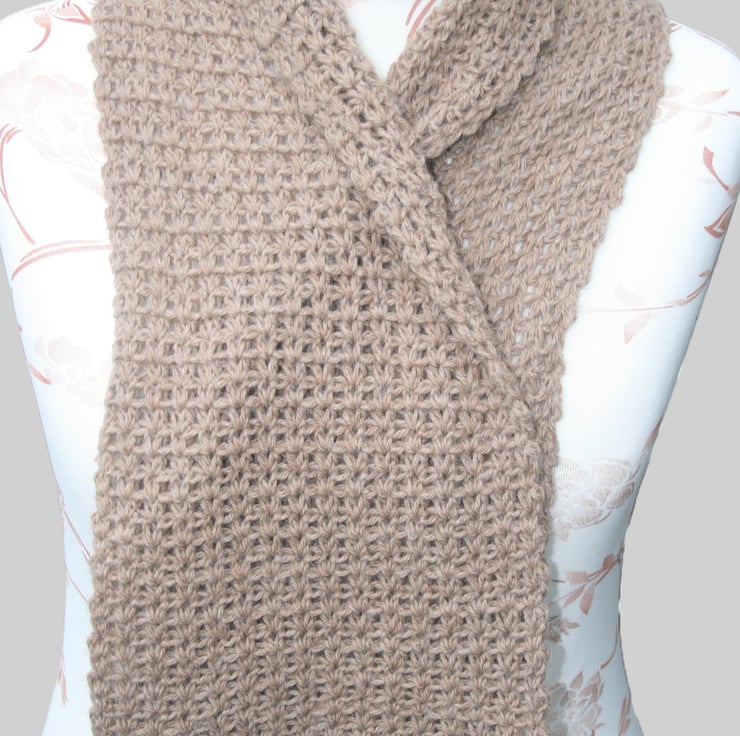 A beautiful and elegant nougat shade of alpaca scarf. It is very soft and the nougat shade looks like a dusky light brown. It is pretty and a versatile addition to your wardrobe. It is ideal for people with sensitive skin, it is Oek-Tex certified and hypoallergenic as it does not contain lanolin. The scarf is made from luxurious yarn, it is a Super Soft Baby Alpaca DK yarn (Drops Puna).