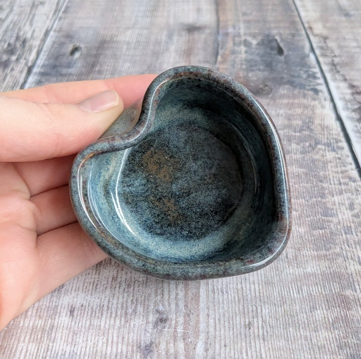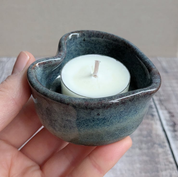 A ceramic tealight holder wheel thrown from a white stoneware clay and shaped into a heart. The glaze shows as bluer where thicker and brown where thinner. It measures about 6cm wide and 3cm high.