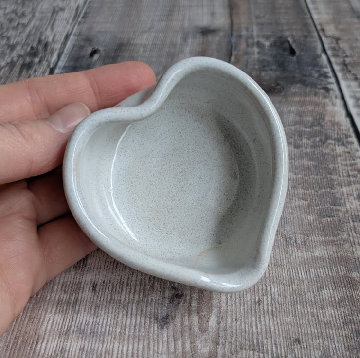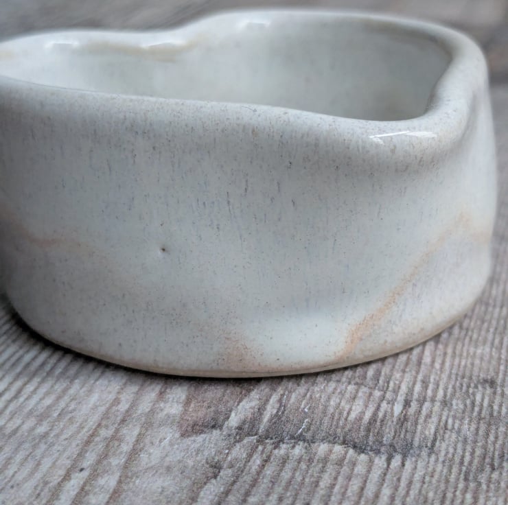 A ceramic tealight holder wheel thrown from a white stoneware clay and shaped into a heart. The glaze is a lovely soft white with variations across the surface. It measures about 6cm wide and 3cm high.