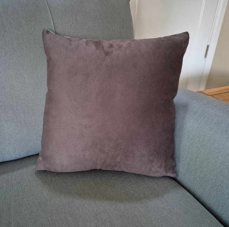 Luxury faux suede 45cm square cushion made using one of my most popular wet cyanotype designs with a charcoal coloured back panel.