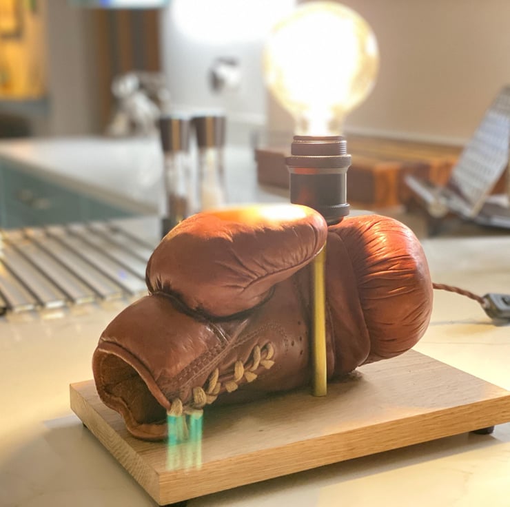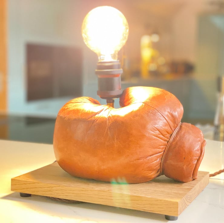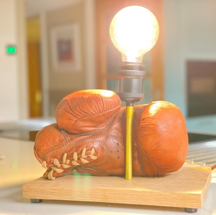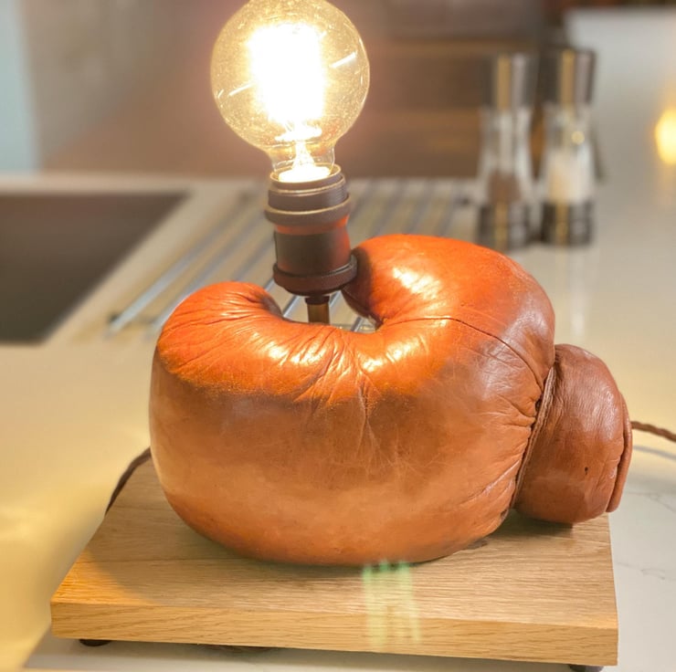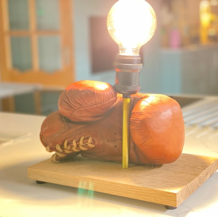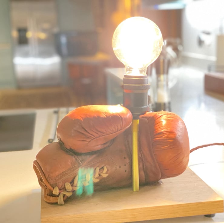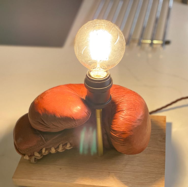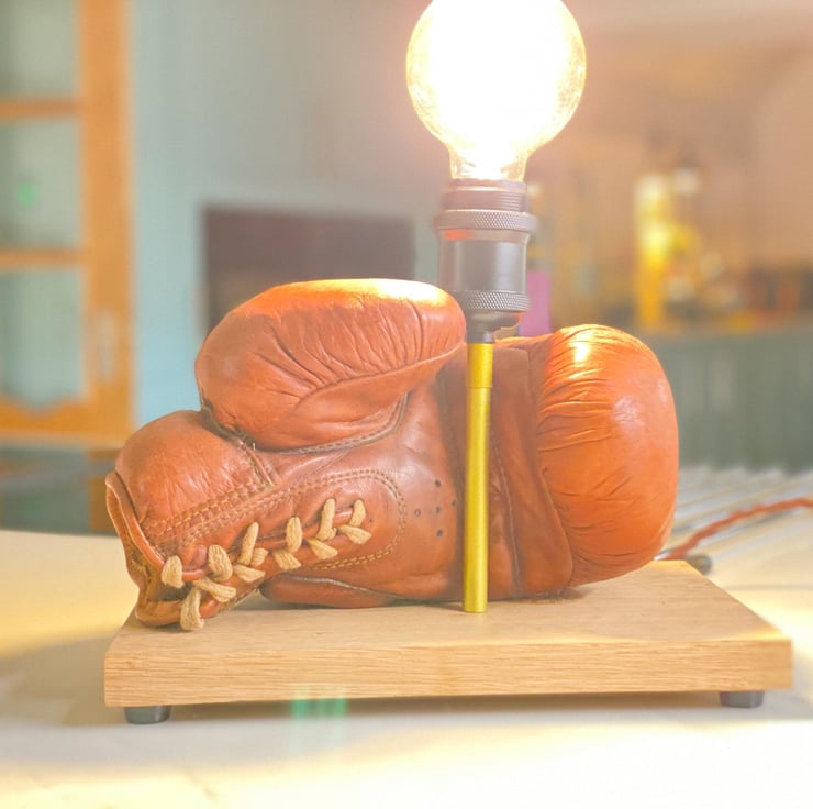 Vintage leather boxing glove which has beed used as a stage prop for many years and is stuffed. One of a pair we have . Mounted onto a solid hardwood timber plinth, feet added to give clearance for the cable . All new electrics including period style twisted brown cable , Bakelite style 3A plug, inline switch , gold colour lampholder extension and a vintage style bulb holder to take standard E27 Edison screw bulbs . (bulb not included ) there is a huge choice. This would look great on a table or shelf in any room but particularly a sporting environment, man cave , bar etc. has been independently PAT tested