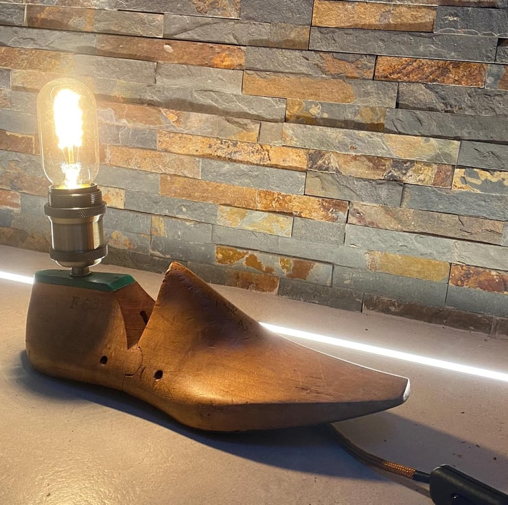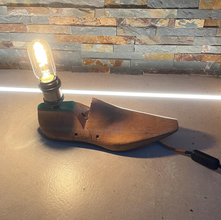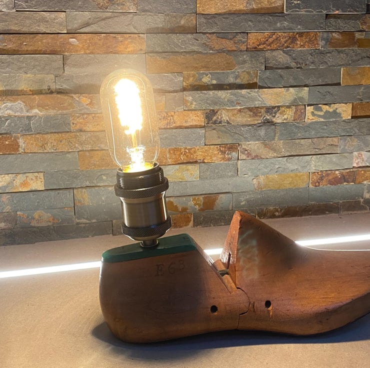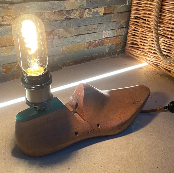 Ive taken an original vintage shoe last drilled and threaded to take take new vintage style lamp holder (Bulb not included ). There is vast choice as is a simple E27 screw fitting. New period braided cable and a bakelite style 3 amp plug. Then independently PAY tested for safety.