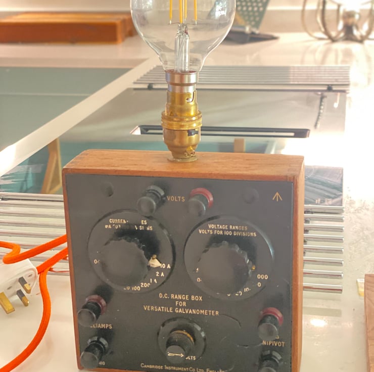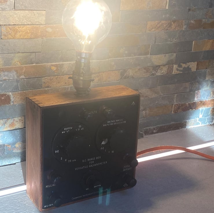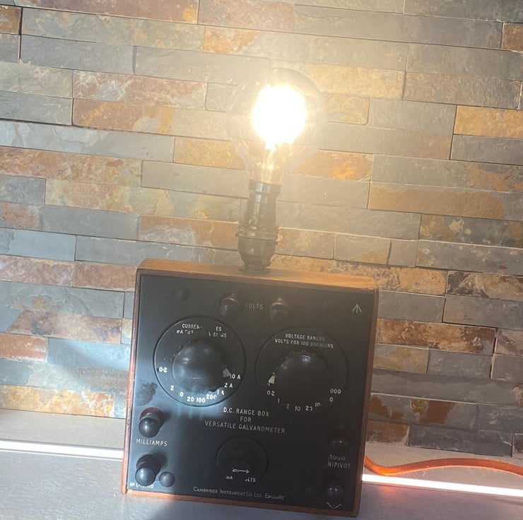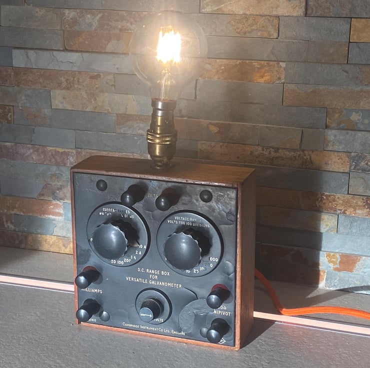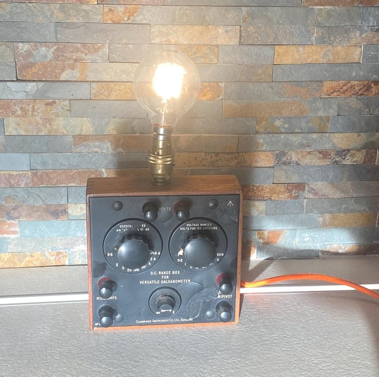 From circa 1950s. Ex military. Up cycled to a unique vintage lamp. The original Volt metre is in good condition with a small amount of repair to the paint remonstrative with use and age. Has been wired with new cable and plug and the brass sample holder is switched. Bayonet fitting with LED vintage style bulb. Independently PAT tested for safety. Great talking piece and unique .