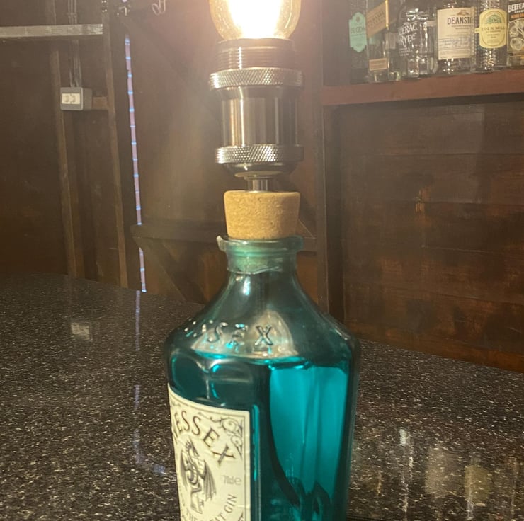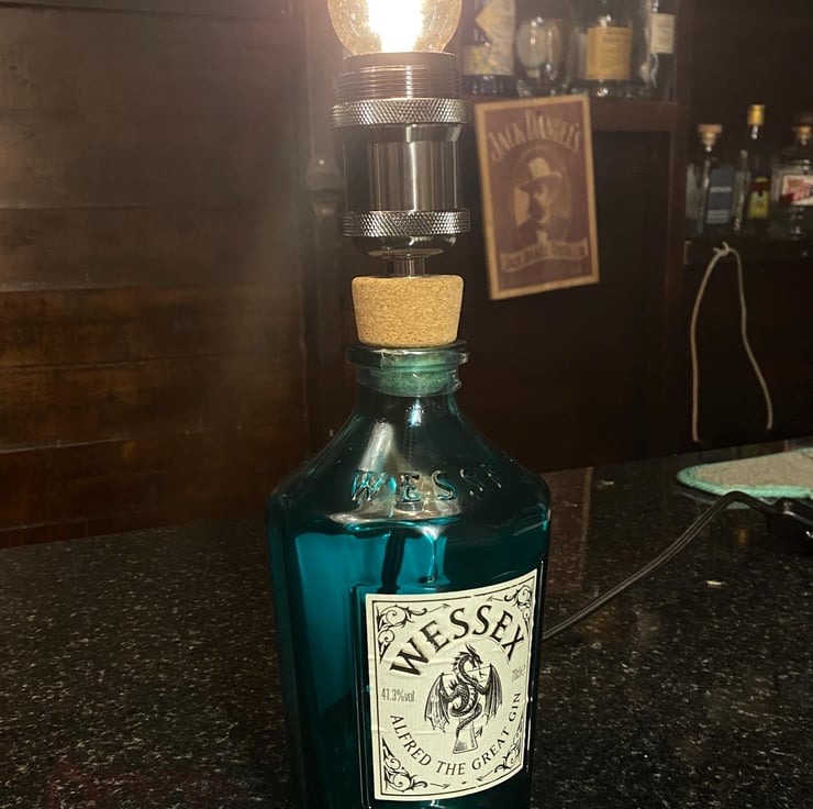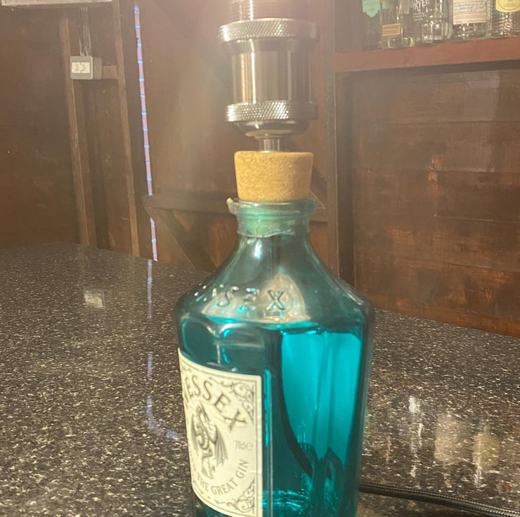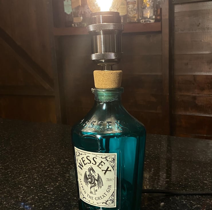 Up cycled spirit bottle , done properly with drilled cable outlet ,new approx 2m retro cable, vintage style plug with 3A fuse. New vintage style lampholder to take E27 Edison bulb (bulb not included ) though we have plenty new available . We have approx 120 different spirit bottles that can be upcycled so if you have a favourite please just ask . If we can accommodate and make bespoke for you we will. This item is in stock and ready for despatch. All our lamps are independently PAT tested. The lamp holder would accommodate any standard size shade should you desire.