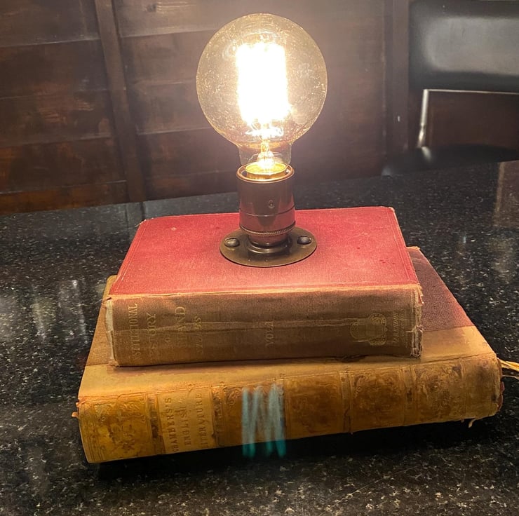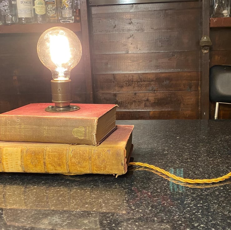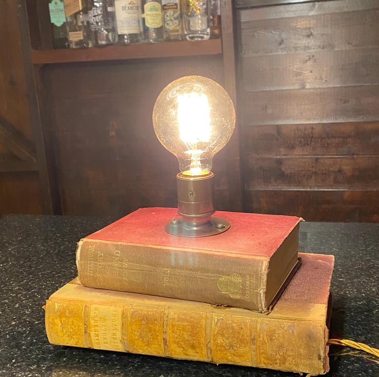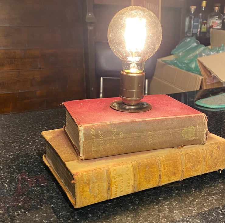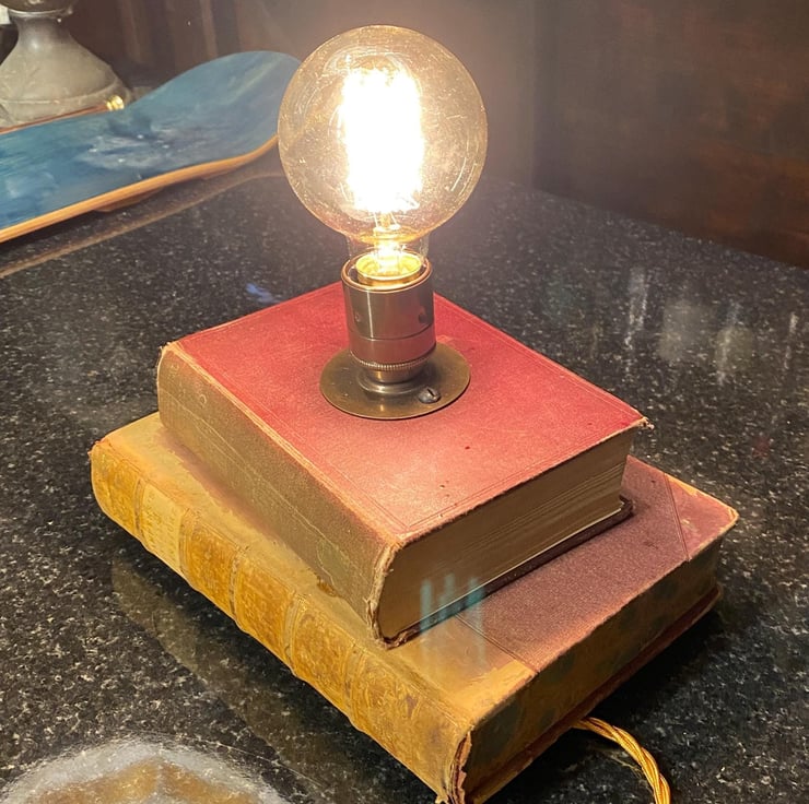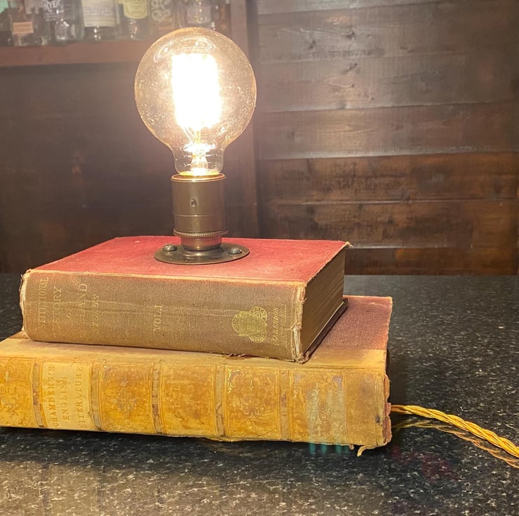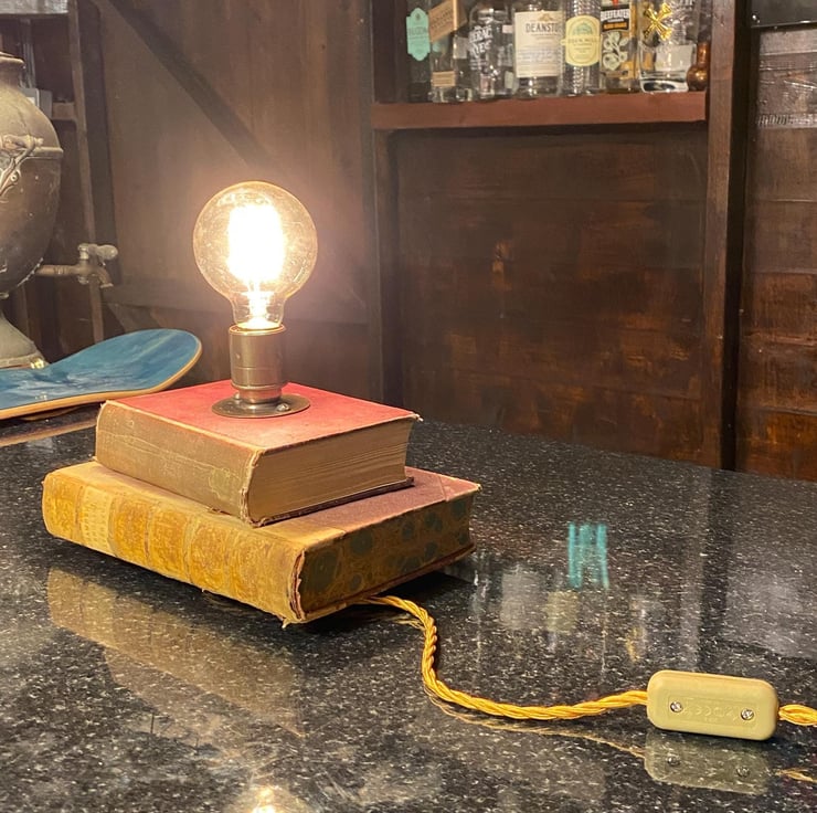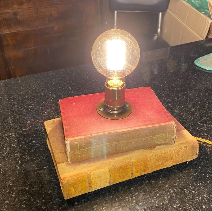 Two late 19th century books from circa 1880s bonded together with feet attached so cable sits ok. Upcyled to a unique and quirky vintage lamp. All made by me with all new quality parts , period cable (approx 2M ) , switch, plug 3 and fused , lampholder., (bulb not included ) as so many to choose from.Includes PAT testing .