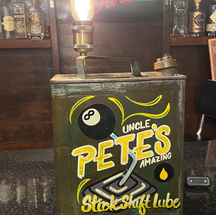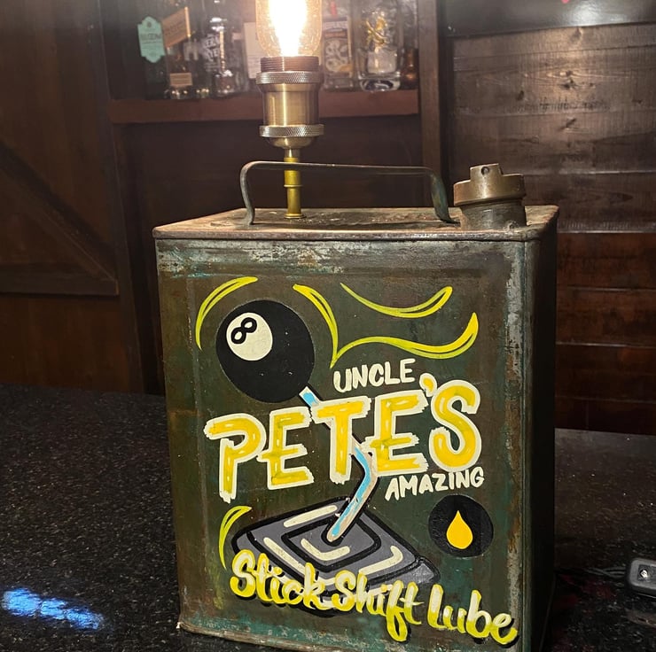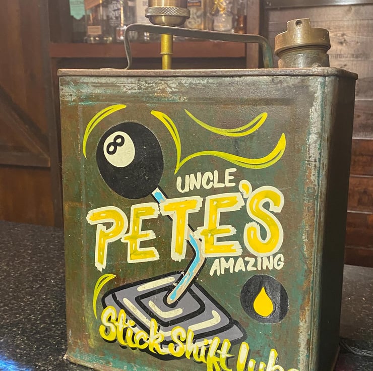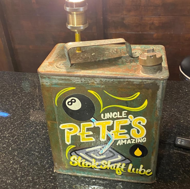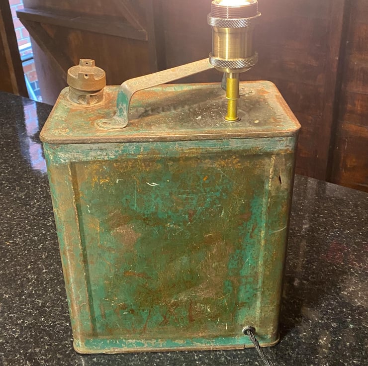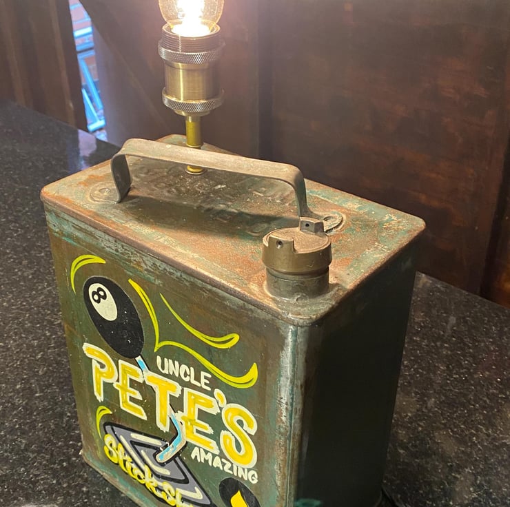 This unique petrol can is One of my own from many years ago , sign written by an artist whom does this work for a living. Recently have up cycled to a desk shelf lamp all done in vintage style with quality new products , Lamp holder and stem with E27 Edison screw fitting (bulb not included ) though we have plenty to choose from if needed. New twisted period cable and inline switch with vintage style plug with 3A fuse. Independently PAT tested.