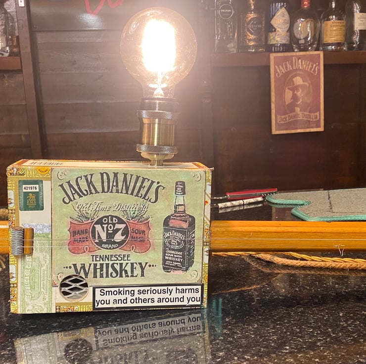 JD Cigar box guitar Up-cycled to a vintage style lamp Hung or free standing.
