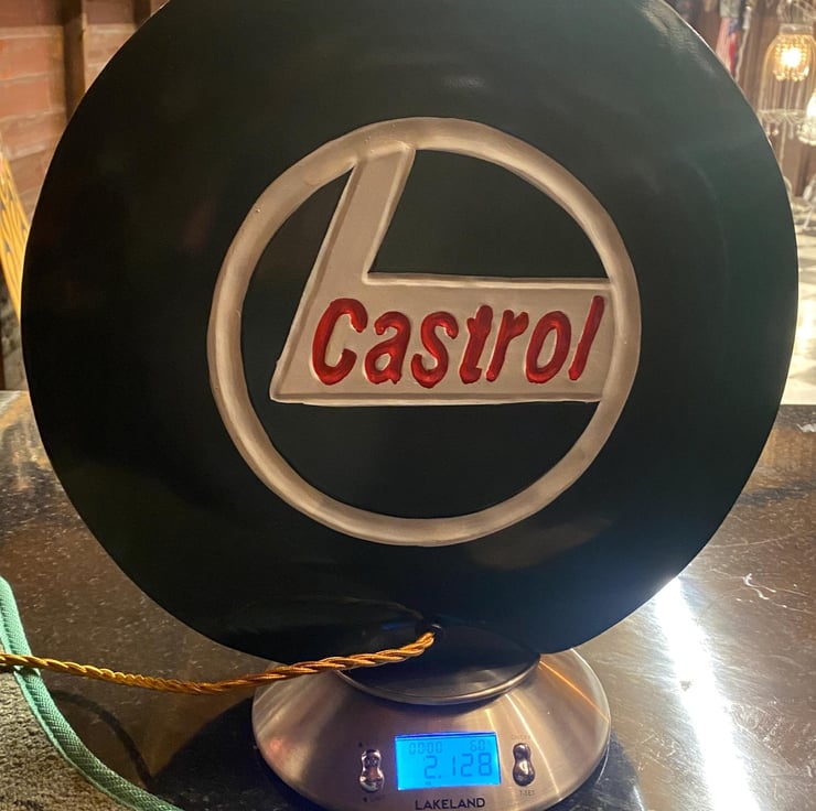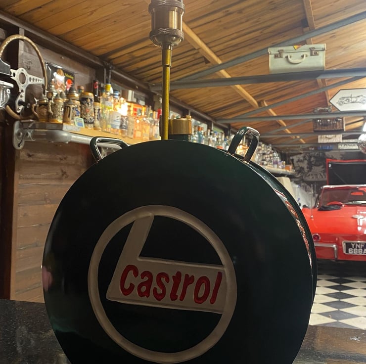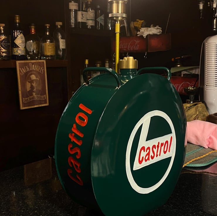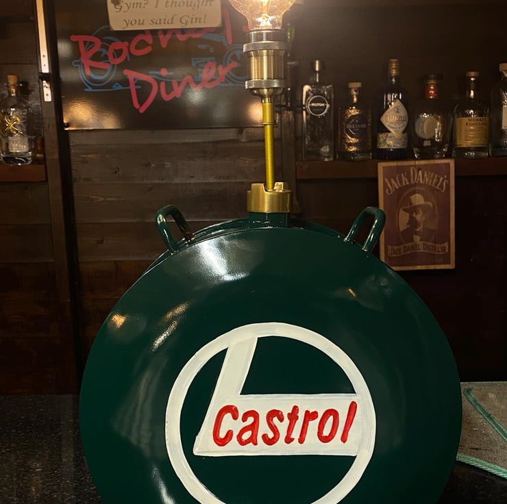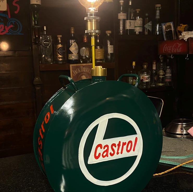This is a reproduction Castrol petrol tin in perfect order with Castrol brass screw lid . I have up cycled to a vintage lamp with quality fittings and been PAT tested . New period wiring , lamp upstand, lamp holder , (bulb not included ) ,plug . Can be posted but would prefer collection 53x37cm.