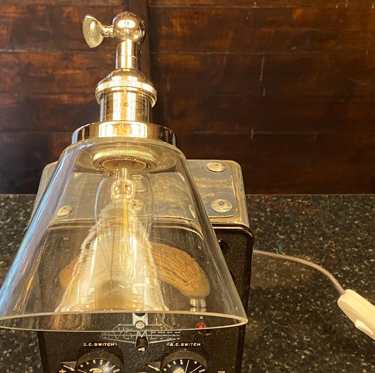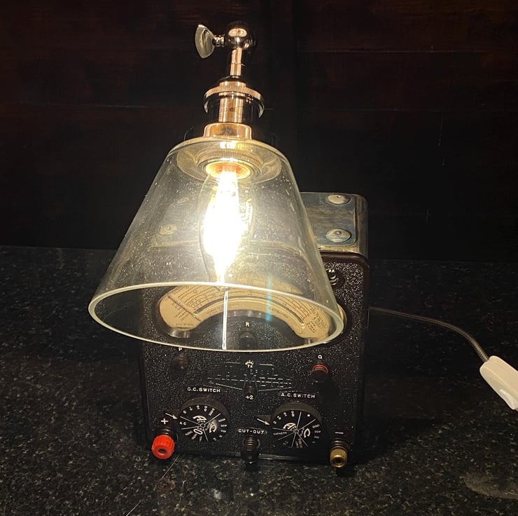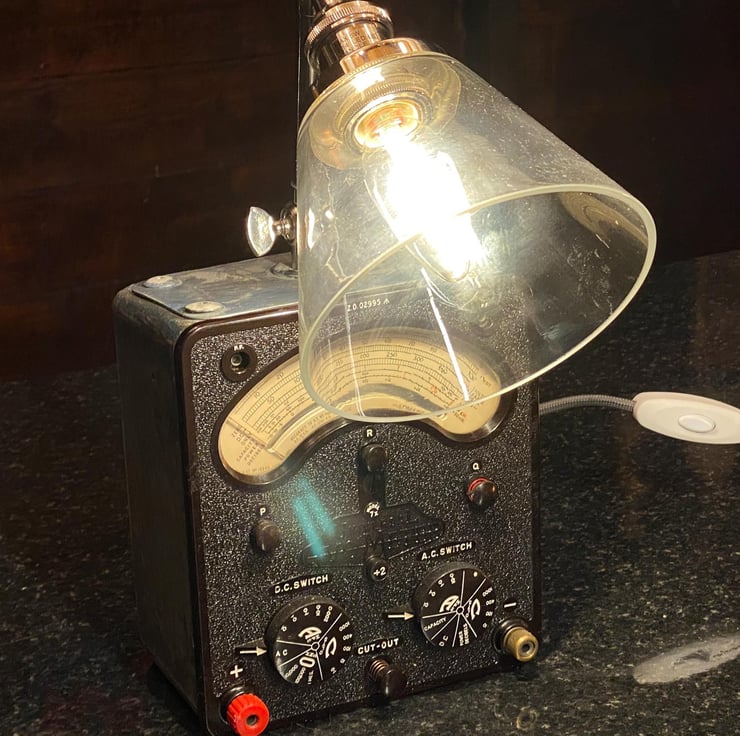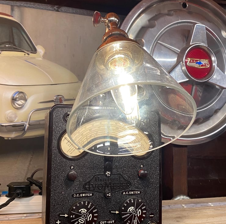 The stainless arm is articulated in 2 places so the glass shade can be put in a multitude of places. . This item has been hand made and is fairly unique all new parts used in conversion the original Avometre is some 80 years old. The original use is no longer valid. Would prefer collection but can post at buyers cost.