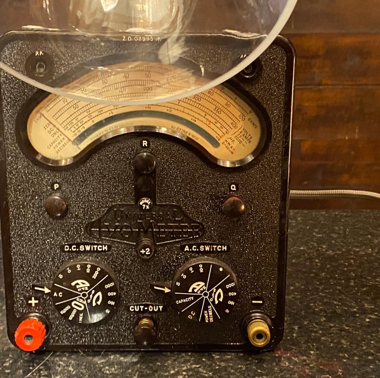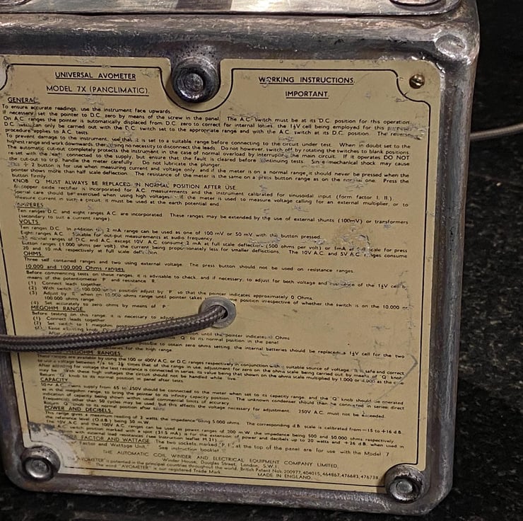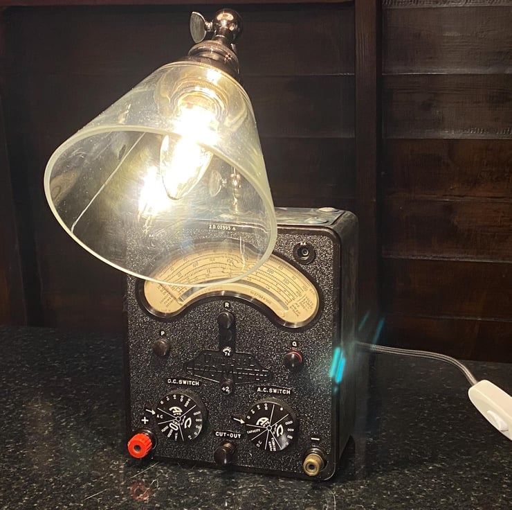An up -cycled desktable lamp created from a 1940s 50s Model 7 Avometre. Converted by an experienced maker with new wiring ,lamp holder and switch and plug. (Bulb not included ) ,Bayonet fitting. Been safety tested. The AVOmeter model 7 was a development of the original AVO multimeter which started life back in 1923, and although that was initially a DC-only instrument many of its features remained almost unaltered right through to the meter shown here. In particular the mirror scale, the "smiley" meter scale, the two switches and two terminals.