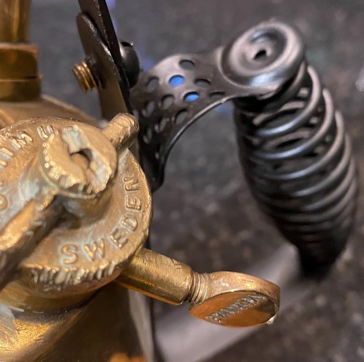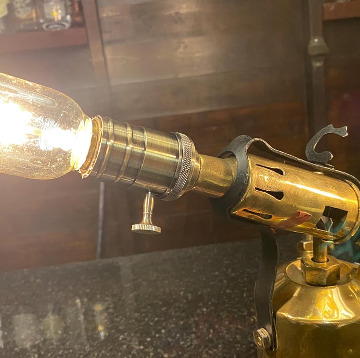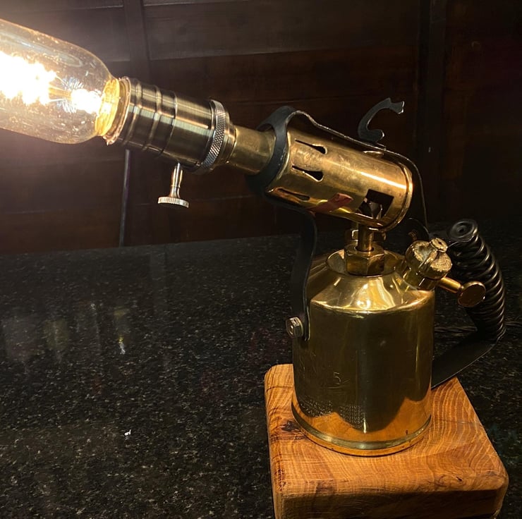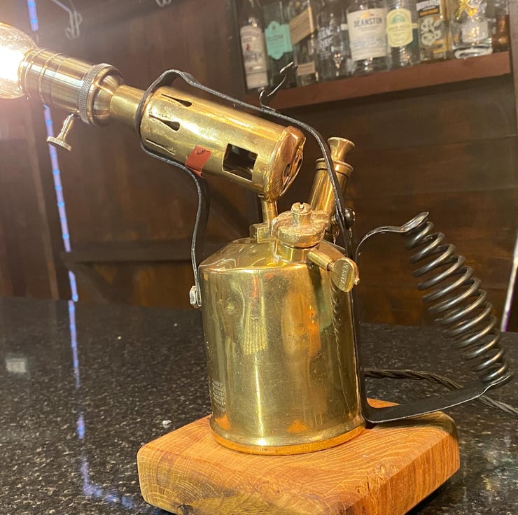 Original polished brass blow torches that have been lovingly restored then up-cycled into these beautiful vintage lamps . All new period wiring, bulb holder,plug,. Edison E27 bulb fitting (bulbs not included ) but have new separately . On a sold timber plinth with etched description of the item . please see pictures . Can buy singular or as a pair ( 150) . Would prefer collection but could post at buyers cost.PAT tested