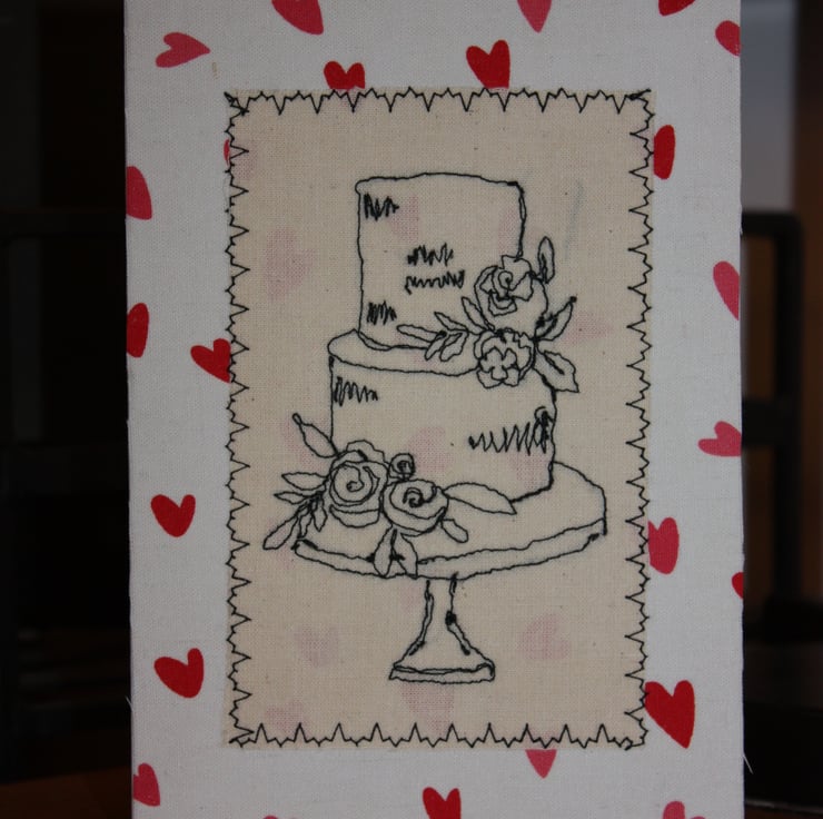 5" x 7" (12.5cm x 17.5cm) on 300g white card with white envelope. Free-stitched wedding cake on unbleached calico with a heart fabric border.