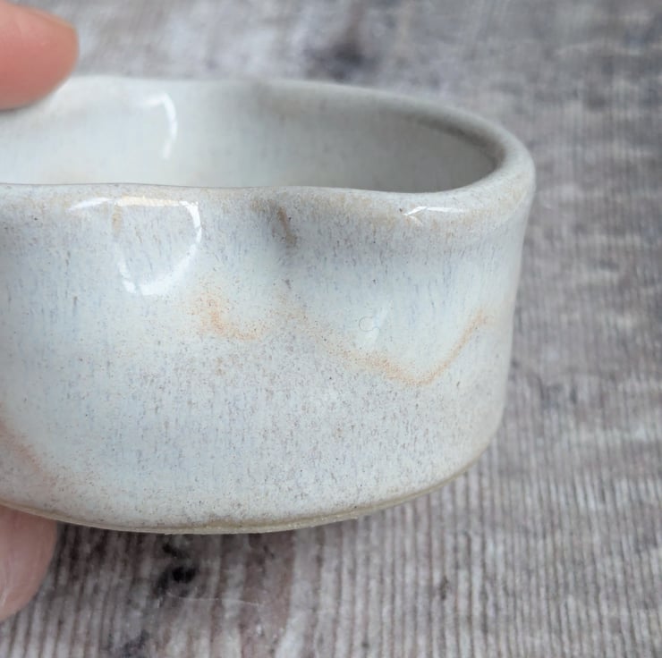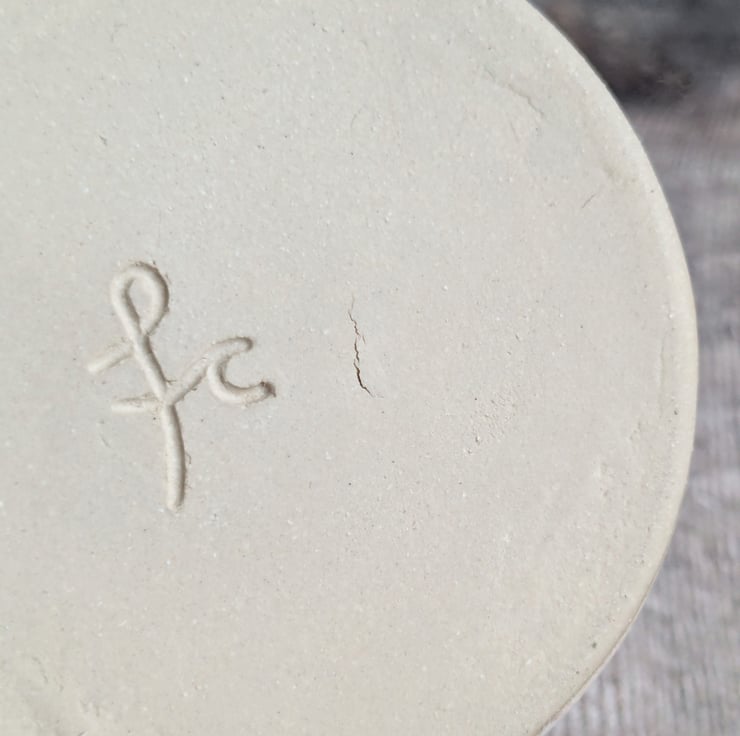 The flaw- A really tiny crack in the base near my initials, see photo 2. Caused when the clay was drying, it really is small, not visible when in use.