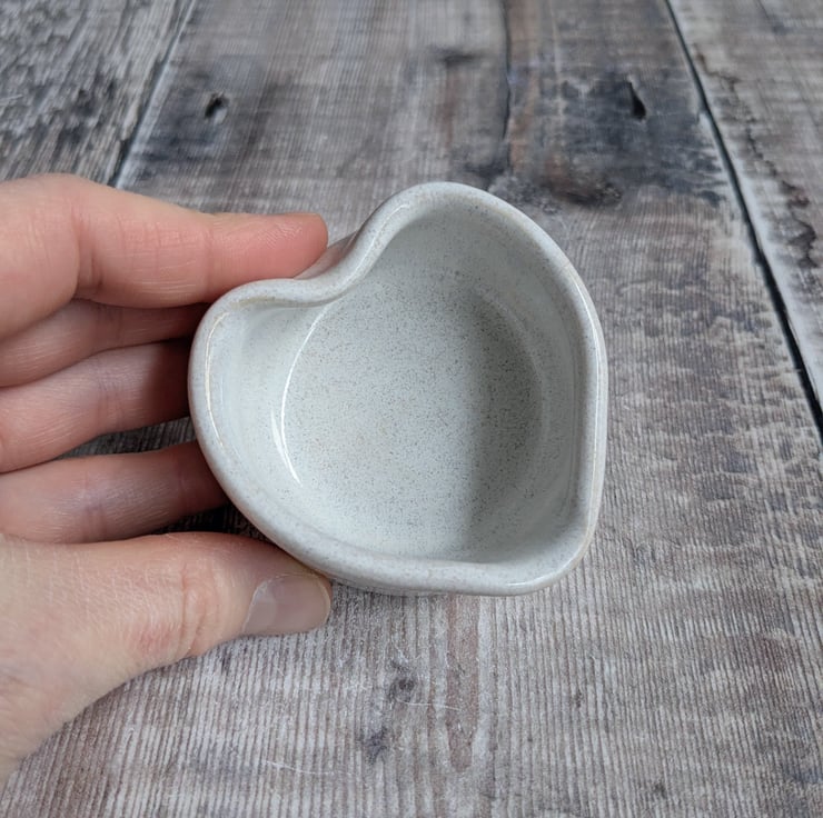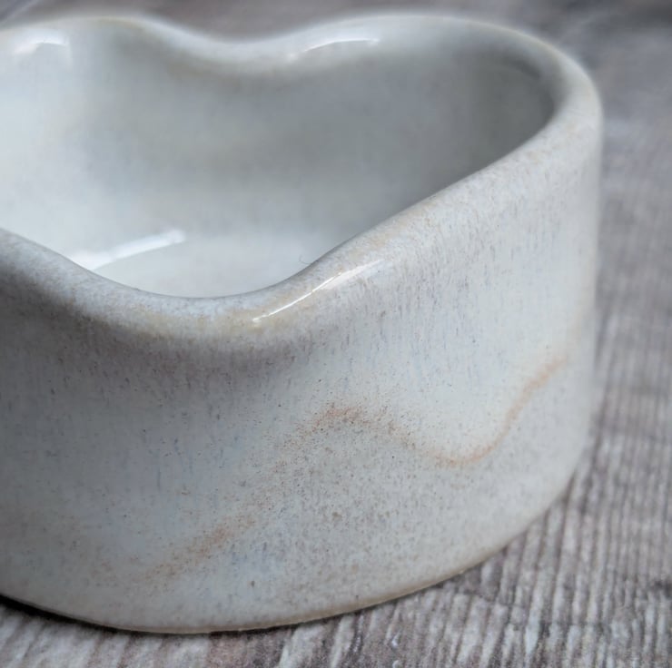 A ceramic tealight holder wheel thrown from a white stoneware clay and shaped into a heart. The glaze is a lovely soft white. It measures about 6cm wide and 3cm high.