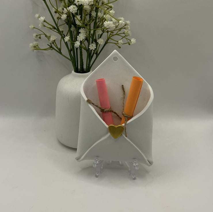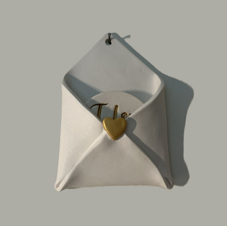 This hanging clay envelope is a thoughtful, hand sculpted piece made to hold tiny treasures, love notes and affirmations. Each one is individually shaped from natural air dry clay and finished by hand, with either a gold lettered “I love you” token or a little set of resin coated hearts.