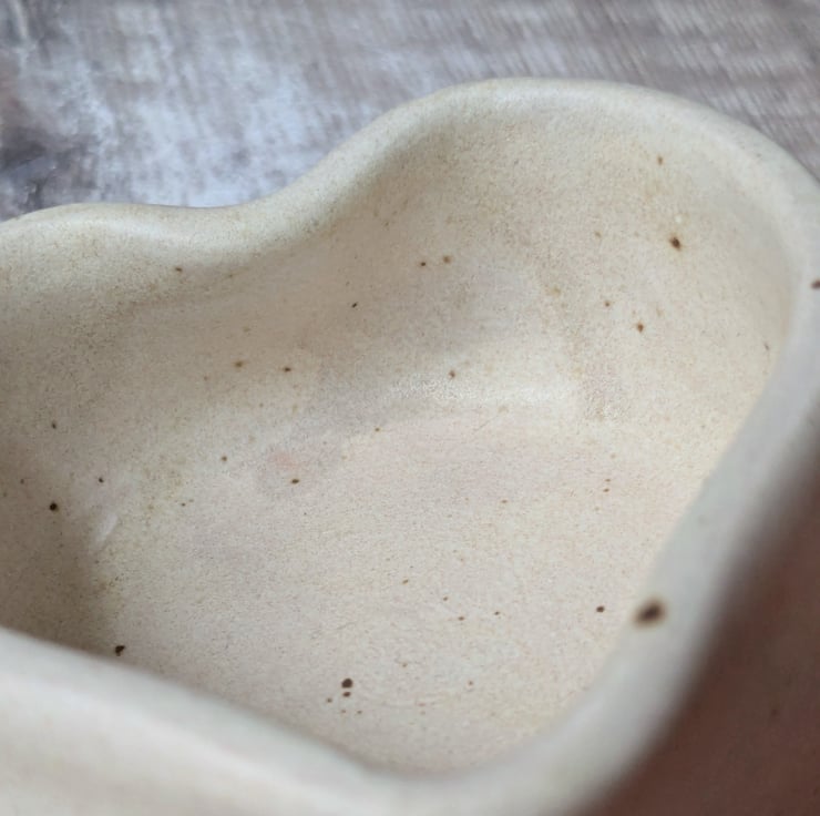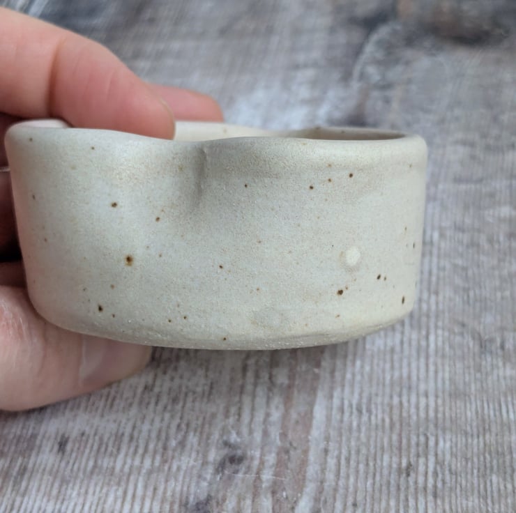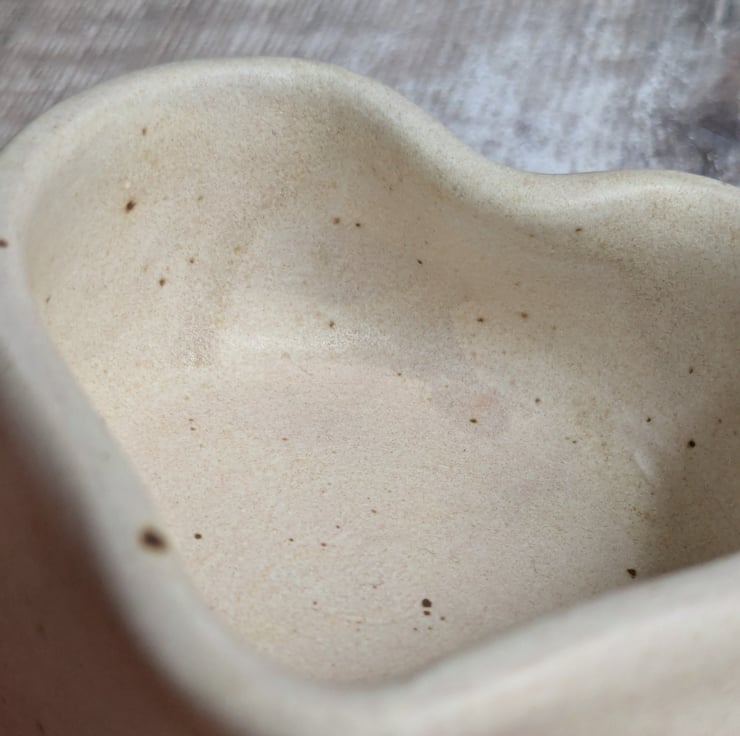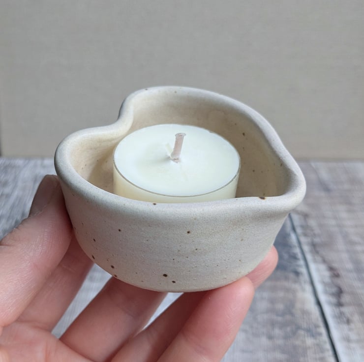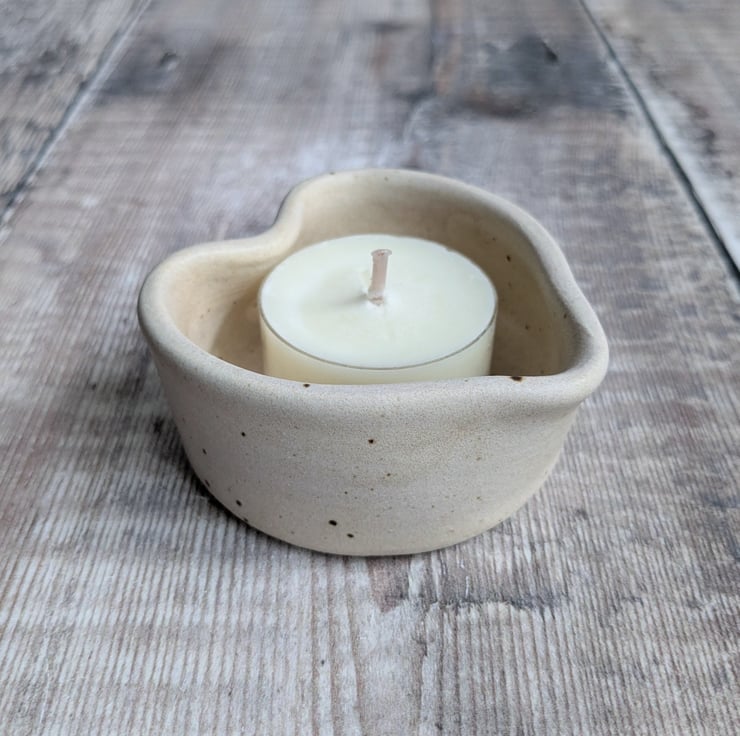A ceramic tealight holder wheel thrown from a white stoneware clay and shaped into a heart. The glaze is a satin creamy colour which a small fleck running through it. It measures about 6cm wide and 3cm high.