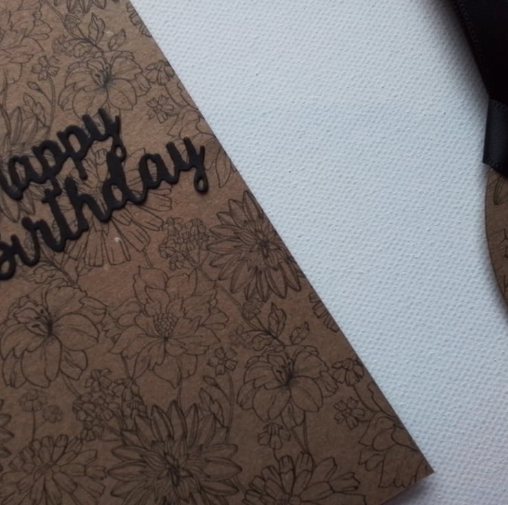 Floral card and matching gift tag in black and buff.