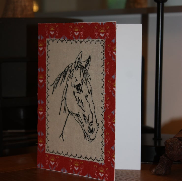 5" x 7" (12.5cm x 17.5cm) on 300g white card with white envelope. Free-stitched horse head on unbleached calico with a red border.