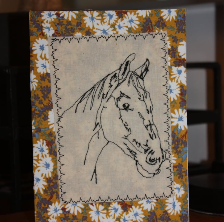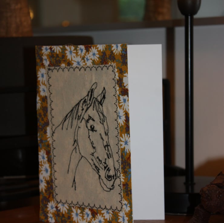 5" x 7" (12.5cm x 17.5cm) on 300g white card with white envelope. Free-stitched horse's head on unbleached calico with a floral fabric border.