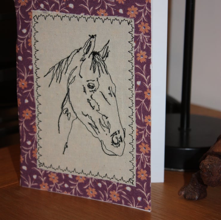 5" x 7" (12.5cm x 17.5cm) on 300g white card with white envelope. Free-stitched horse's head on unbleached calico with a floral burgundy fabric border.