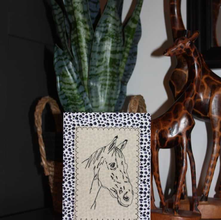 5" x 7" (12.5cm x 17.5cm) on white rough 300g card with white envelope. Free-stitched horse's head on unbleached calico with an animal print fabric border.